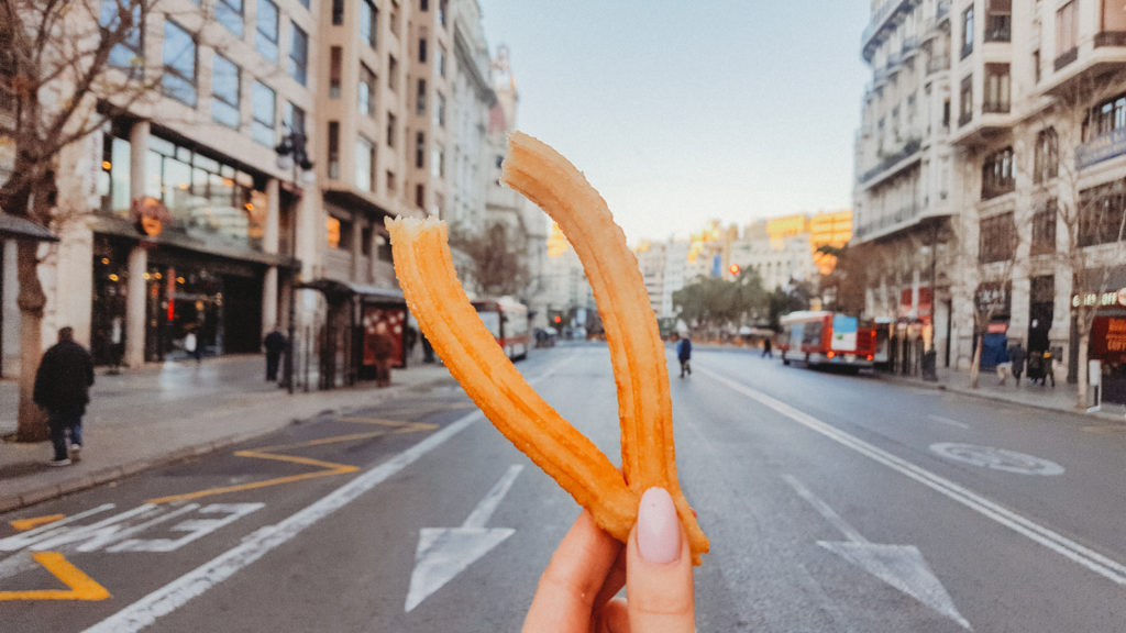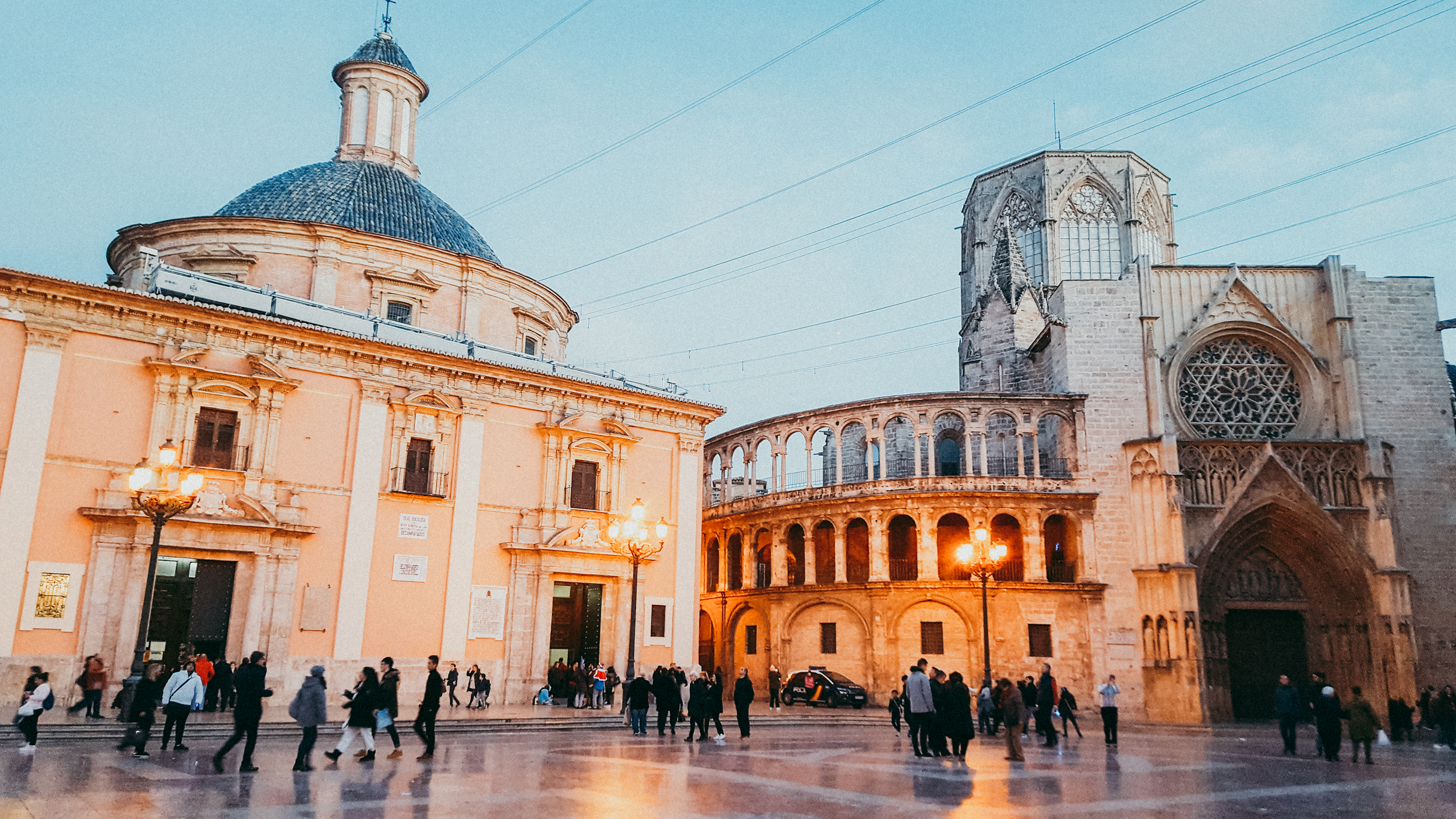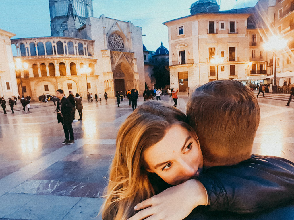 Komunikacją miejską dostaliśmy się pod zabytkowy budynek dworca Estacion del Norte, który usytuowany jest tuż obok jednej z największych aren w Hiszpanii Plaza de Toros. Stamtąd udaliśmy się w kierunku serca miasta, czyli Plaza del Ayuntamiento. Plac z każdej strony otoczony jest bardzo wysokimi budynkami o zróżnicowanych fasadach. W centrum znajduje się ratusz miejski, a obok okrągła fontanna, pod którą koniecznie trzeba zatrzymać się na selfie:) Wysokie budynki nie są po prostu wysokie, są monumentalne! Stojąc na środki drogi, która w okresie świątecznym była zamknięta dla ruchu samochodowego, miałam wrażenie, jakby budynki rosły i przechylały się w moją stronę, jak… w Incepcji!