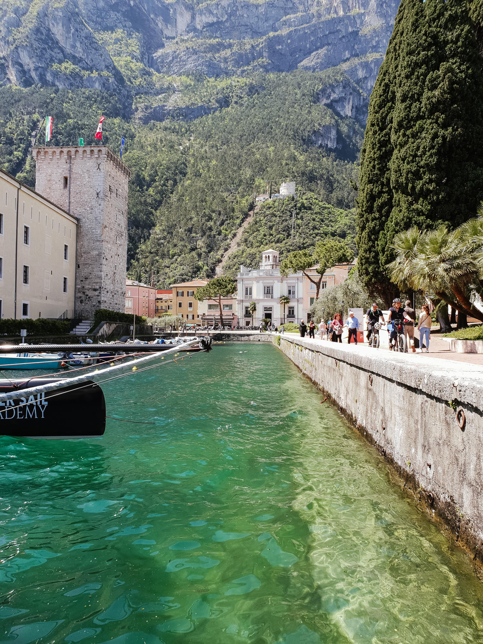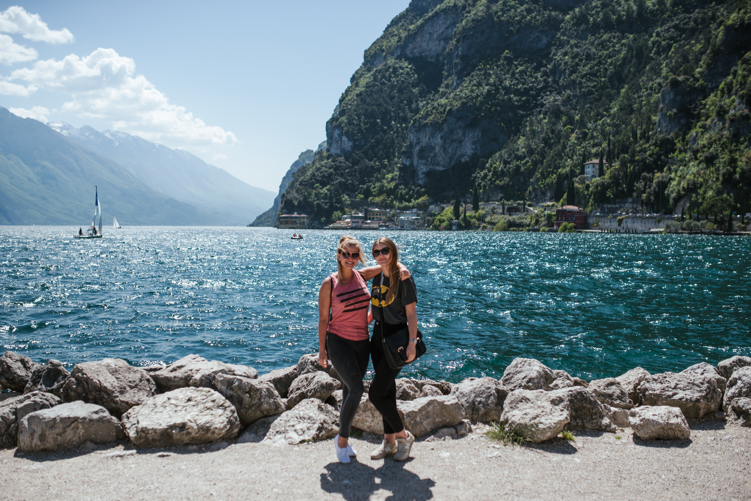 No i nadeszła:)! Przekonaliśmy się o tym robiąc pierwszy przystanek nad włoskim jeziorem, w Riva del Garda. Tam też po raz pierwszym podczas naszej podróży skosztowaliśmy pizzy, zwykłej margarity, która wraz z pierwszym kęsem wynagrodziła nam cały trud nocnej podróży. Riva to jedno z popularniejszych miast nad jeziorem i nic w tym dziwnego, malowniczo położne nad wodą, z każdej strony oblegane przez wysokie góry, zachęca do tego żeby po prostu usiąść na ławeczce i spędzić cały dzień gapiąc się w wodę.