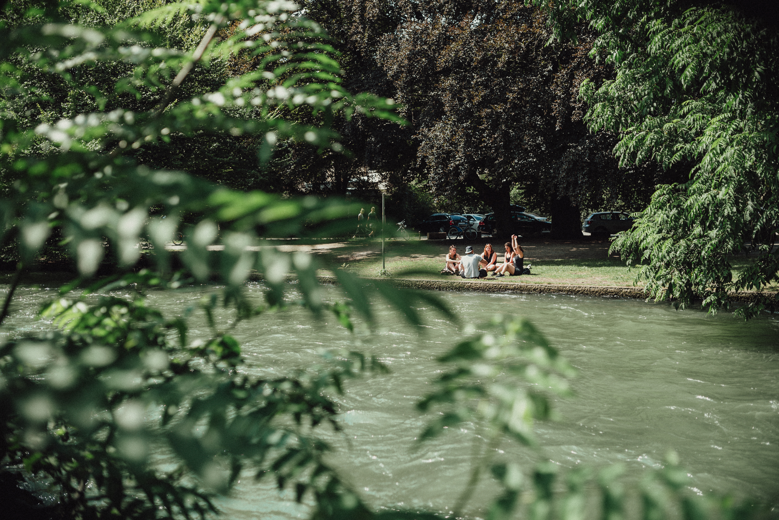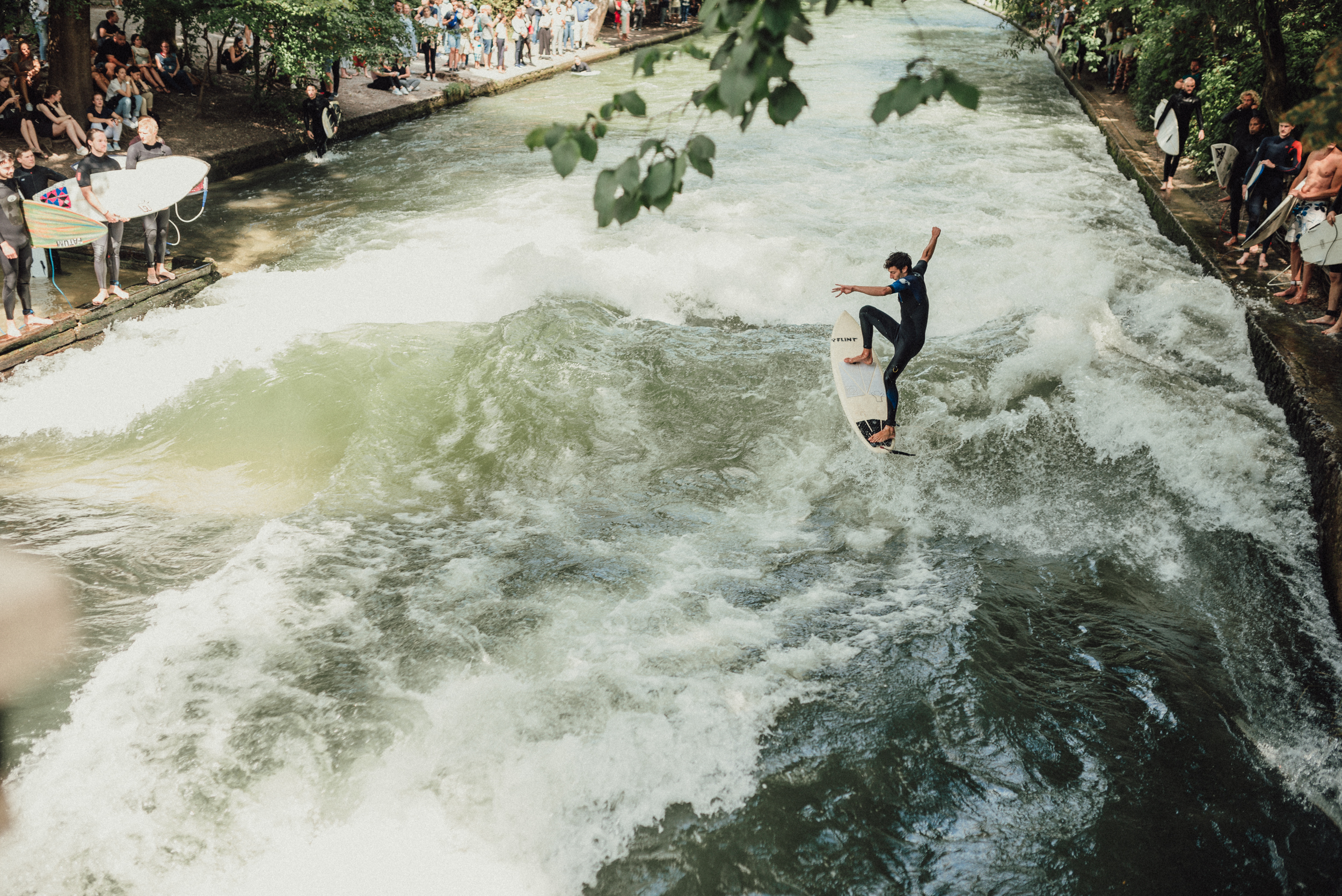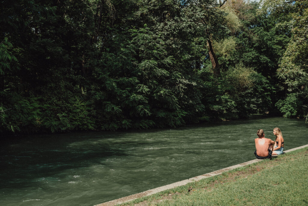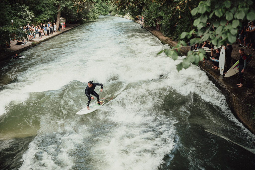 Dla spragnionych adrenaliny park zapewni jeszcze jedną, bardzo widowiskową atrakcje. Przez środek przepływa lazurowy potoczek Eisbach, w którym teoretycznie obowiązuje zakaz kąpieli, ale w praktyce w upalne dni nie jest on respektowany przez złaknionych ochłody Monachijczyków. Jednak nie sam nurt i kolor wody jest tu najciekawszy, a fala, po której surfują na deskach miejscowi.