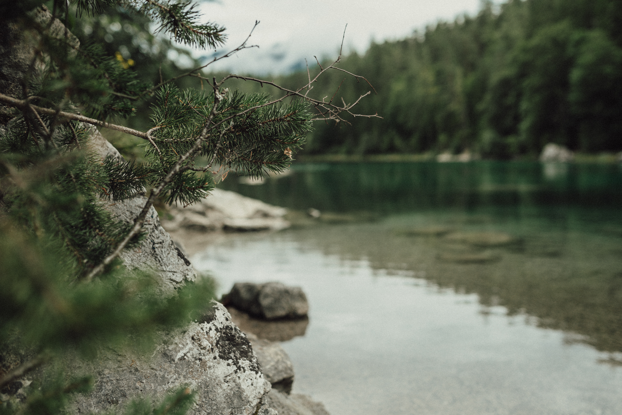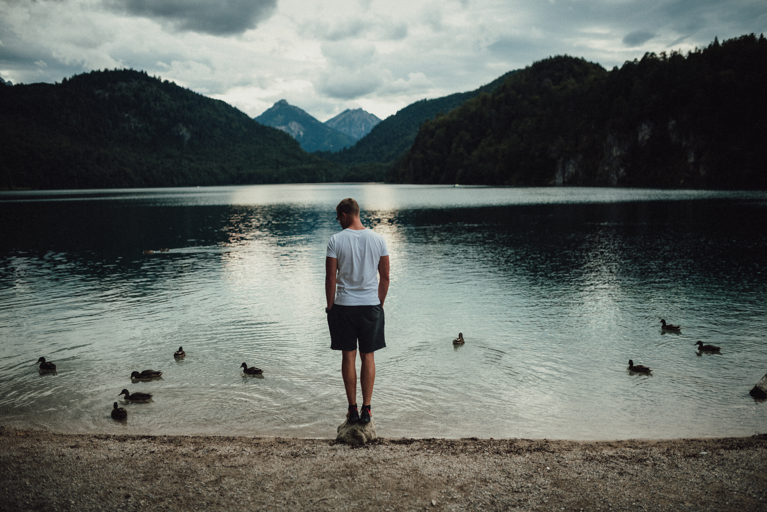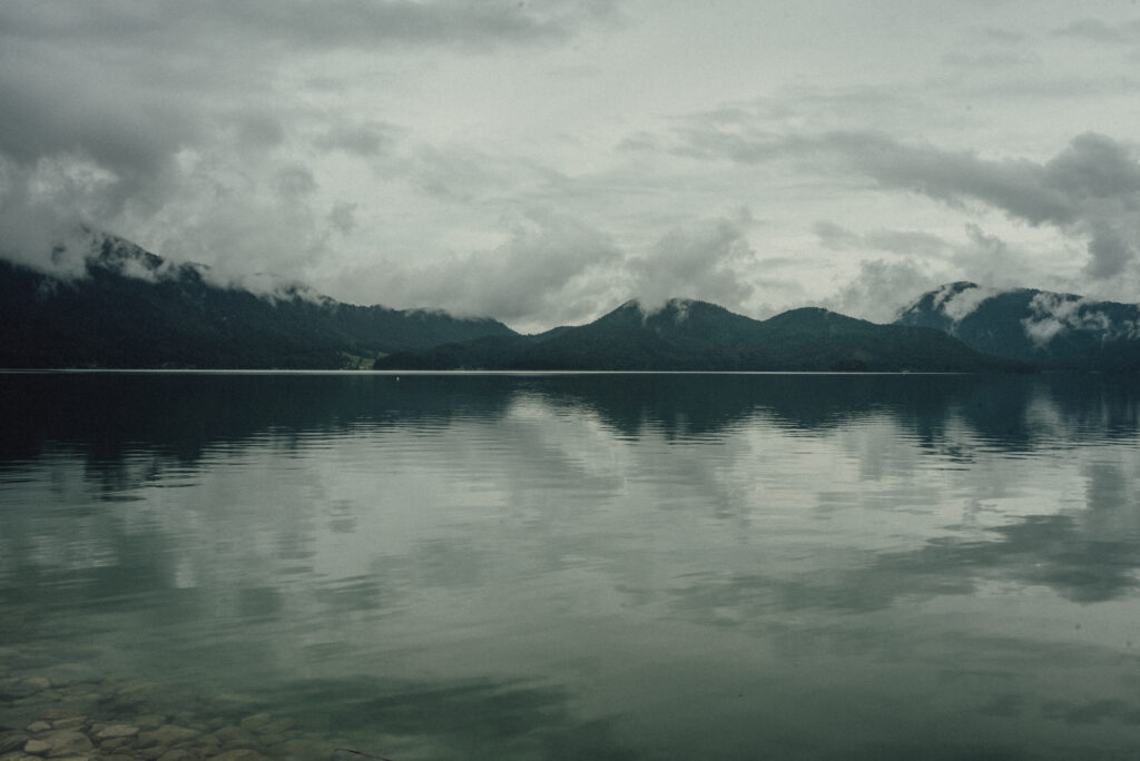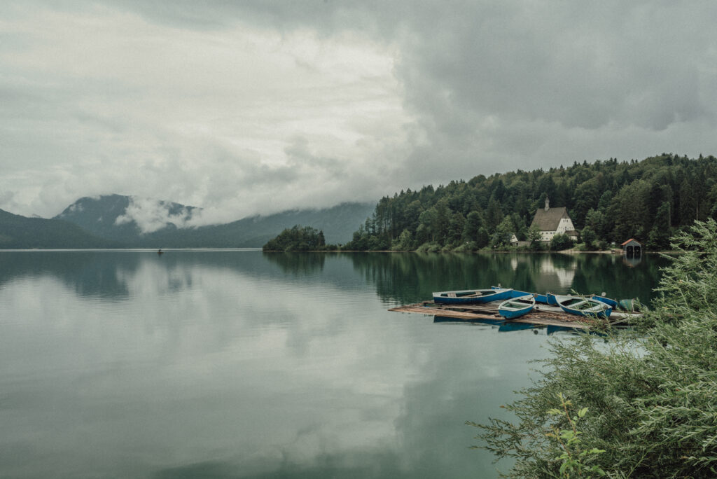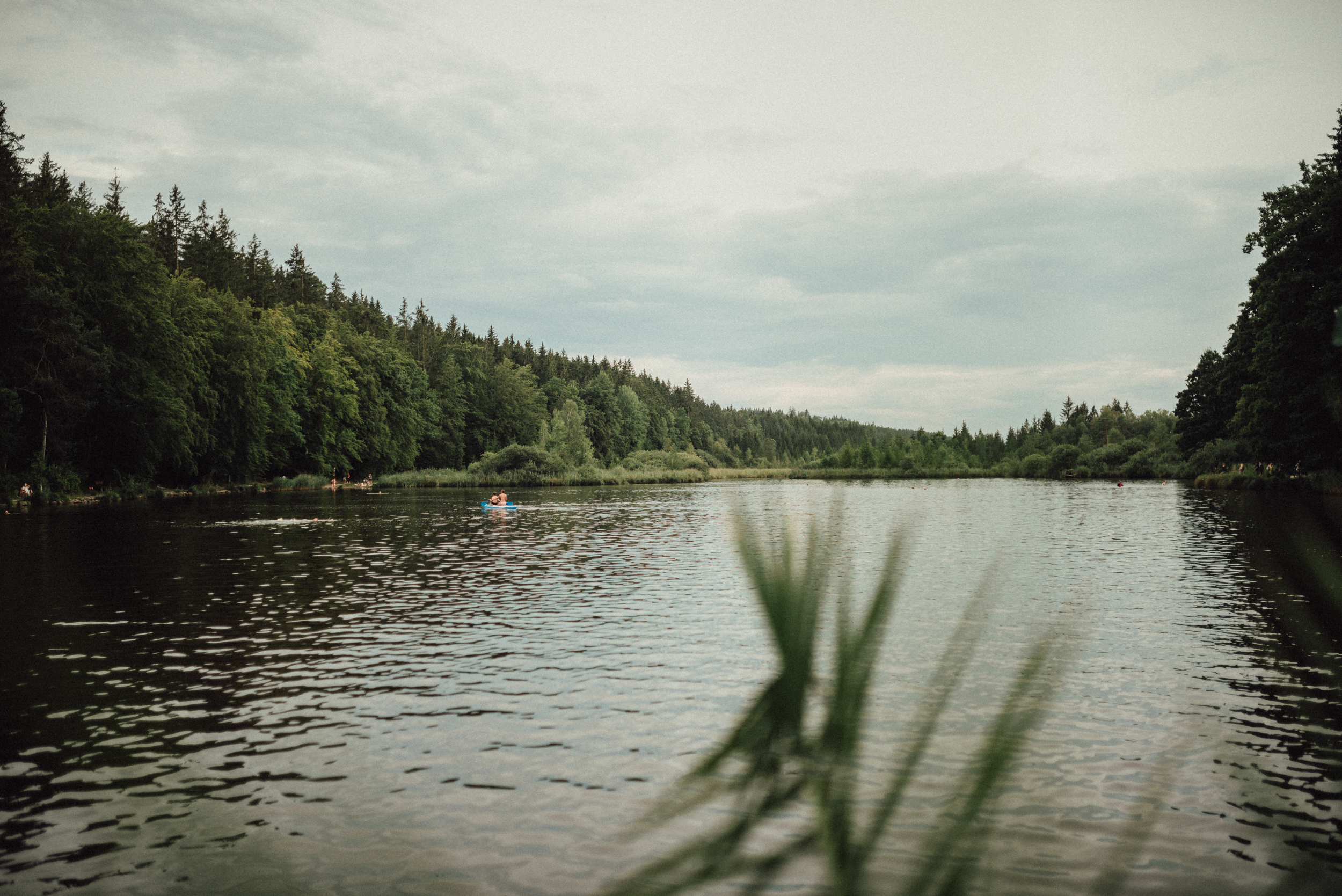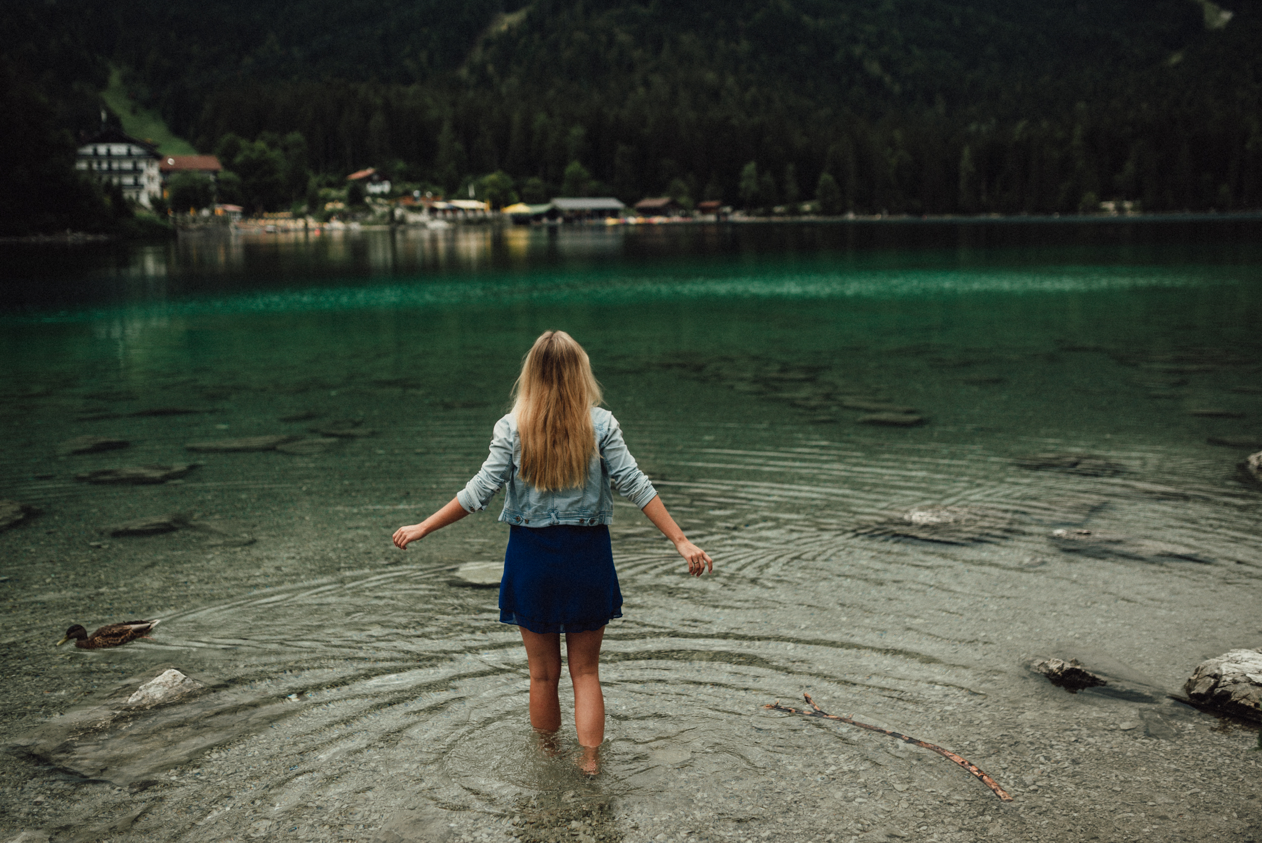 Tego jak i poprzedniego dnia Bawaria przywitała nas niespecjalnie zachęcającą do wystawienia nosa spod kołdry pogodą. Z nieba lał się deszcz, wszystko było spowite chmurami, nad koronami drzew unosiła się gęsta mgła i znikąd nie zanosiło się na poprawę tego stanu! Nie zniechęciło nas to jednak do dalszej podróży. Po śniadaniu, uzbrojeni w jeden lichy parasol ruszyliśmy w kierunku Eibsee, które w przeciwieństwie do kilku poprzednich akwenów, nad którymi zatrzymaliśmy się podczas wyjazdu, było dużo bardziej komercyjne. Co przez to rozumiem? Masa turystów i co chwilę kursujące autokary z wycieczkami, ale niech Was to nie zniechęci! Nad Eibsee jest pięknie! Woda ma tam głęboki szmaragdowy kolor nawet, kiedy nie przegląda się w nim żaden promyk słońca. Dodatkowym atutem tego, jak i każdego innego zbiornika w tym regionie jest to, że można się w nim kąpać, w dowolnym miejscu! Pragniesz ochłody, ściągasz gatki i korzystasz na całego z przyjemnego orzeźwienia.