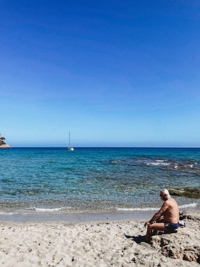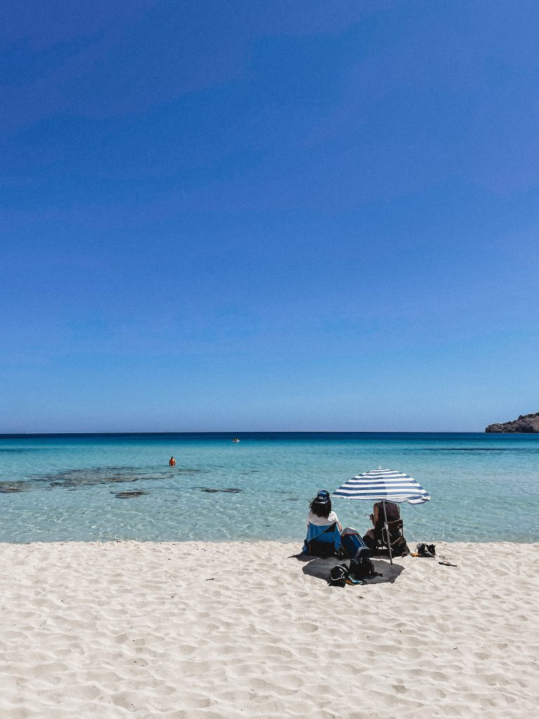 Odpowiedzialność za poszukiwanie miejsca na popołudniowe plażowanie postanowiłam przerzucić na małżona. W obawie przed gniewem, który może na mnie spaść, jeśli po raz kolejny zafunduje mu wyczerpujący maraton z metą na kamiennej plaży, przekazałam mu pokornie pałeczkę organizatora. Tak oto trafiliśmy na Cala Marcal, plażę o której nie słyszałam, nie czytałam, której nikt nie rekomendował, a okazała się bardzo przyjazna, zwłaszcza dla podróżujących w modelu 2+…