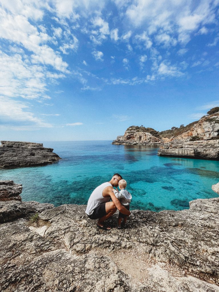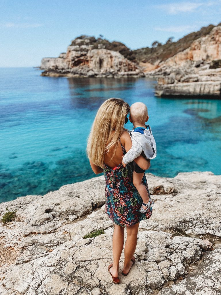 Pełna optymizmu zaproponowałam wycieczkę na jedną, z ponoć najpiękniejszych we wschodnim rejonie,  plaże. Kiedy zbliżaliśmy do celu nawigacja, wbrew znakom zakazu, natarczywie nakłaniała nas do skrętu. W obawie przed (być może kolejnym już) mandatem zaparkowaliśmy ponad kilometr drogi od miejsca docelowego. Wcześniej jeszcze dla pewności, swoim raczkującym hiszpańskim zapytałam pobliskich robotników, czy na pewno: aparcamiento aqui?! W odpowiedzi usłyszałam: si, si, aqui! Uznałam więc, że jesteśmy we właściwym miejscu i nic złego nie powinno się wydarzyć.Do Cala s’Almunia szliśmy w ciszy, lekko niepewni tego, czy aby na pewno dotrzemy tam gdzie chcemy dotrzeć. Napięcie budowała też rozkapryszona tego dnia pogoda, która nie mogła się zdecydować, czy doszczętnie nas zmoczy, czy tylko postraszy. Na ostatnim odcinku trasy dramaturgii dodały pionowe skalne schody prowadzące do plaży. Z Jaśkiem na rękach i z lekko rozedrganymi łydkami ruszyłam na dół, za mną małżonek z ponad 10- kilogramowym wózkiem pod pachą. Na miejscu olśniewające widoki… niekończący się błękit, malownicza zatoczka i wszystko to czego rodziny z dziećmi nienawidzą, czyli wystające, ostre kamienie i niebezpieczne przepaści, wyjątkowo kuszące dla naszego ciekawskiego malucha. Miejsce niezwykle romantyczne i bardzo „niedzieciowe”. Pokarmiliśmy przez chwilę wzrok, wdech- wydech i ruszyliśmy tą samą drogą z powrotem.