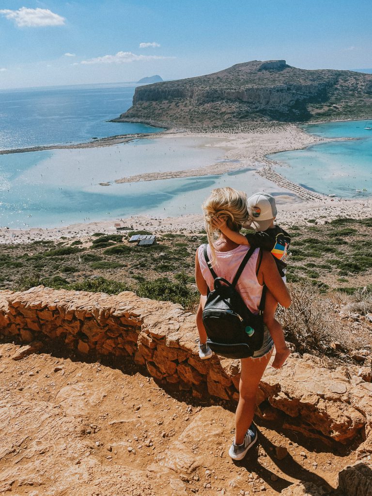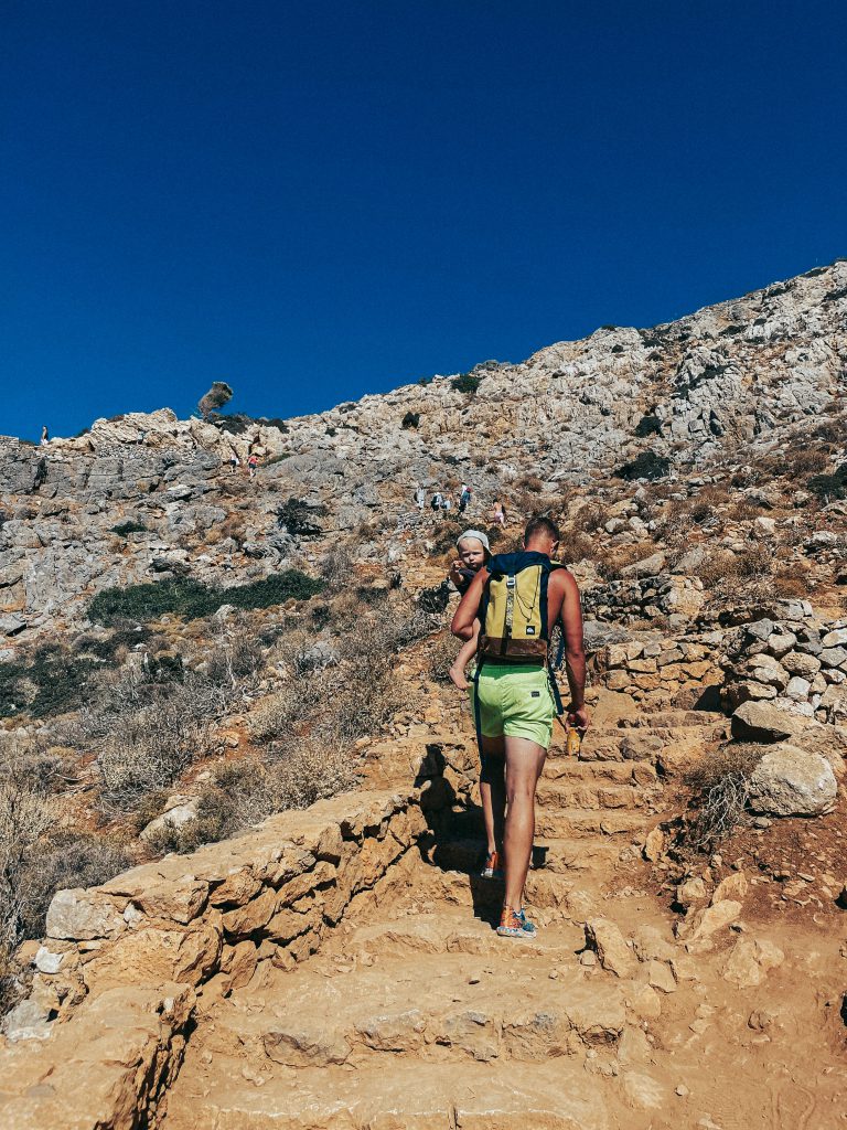Nie ten odcinek był dla nas największym wyzwaniem, a Jan, który wybujany na dziurawej drodze, zasnął dosłownie na 5 minut przed metą! Zupełnie nie wiem po kim odziedziczył to wyczucie czasu;) Na wysokości zadania jak zawsze stanął kochany tata! A zadanie nie było łatwe, bo z parkingu na plaże prowadziła wąska i kamienista ścieżka ciągnąca się przez ok. półtora kilometra. Temperatura tego dnia również nas nie oszczędzała. Dodatkowo w tym samym kierunku podążało mnóstwo ludzi, w klapkach, sandałach, koturnach (!), ogólnie rzecz ujmując, obuwiu które nie ułatwiało im dojścia do celu i tamowało ruch. Dodając do tego ilość przystanków na zrobienie zdjęcia, które każdy chciał mieć, bo to z góry Balos jest najbardziej imponujące, robi się nam niezły kocioł. Przypominam, że na Krecie byliśmy w połowie września! Ciarki przechodzą mnie na samą myśl, jak ta sama droga wygląda w szczycie wakacyjnego sezonu.