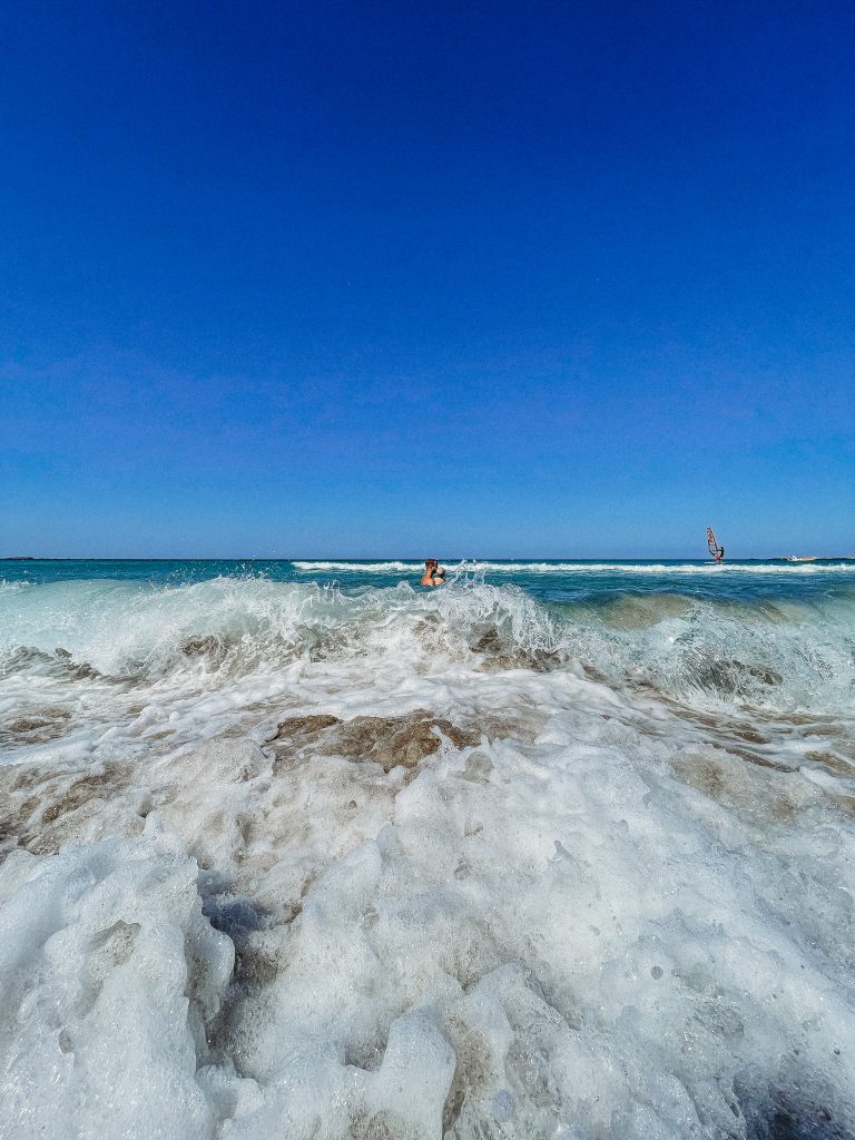 Falasarna – tak nazywa się plaża, na którą wybraliśmy się kolejnego dnia. Szeroka i piaszczysta. Faworyt mojego małżonka, ale to przez fale! Andrzej jest wielkim fanem wzburzonego morza, a to co się wyprawia na Falasarnie to zdecydowanie coś co mu bardzo odpowiadało. Dojazd nie był skomplikowany, a po drodze mijaliśmy kilka uroczych knajpek z widokiem na morze. Myślę, że warto zatrzymać się w którejś z nich i przez chwilę podładować zmysł wzroku przed dalszą podróżą😊 Na miejscu był też parking – kolejny bezpłatny. I tutaj, skoro już o parkingach na Krecie mowa, to na chwilę zaparkuje dalsze opowieści i dokonam ważnego wtrącenia! Dacie wiarę, że ani razu podczas naszego 7-dniowego pobytu nie zapłaciliśmy za parking?! Nic, zero! Przyznam, że po Majorce to było bardzo miłe zaskoczenie.
