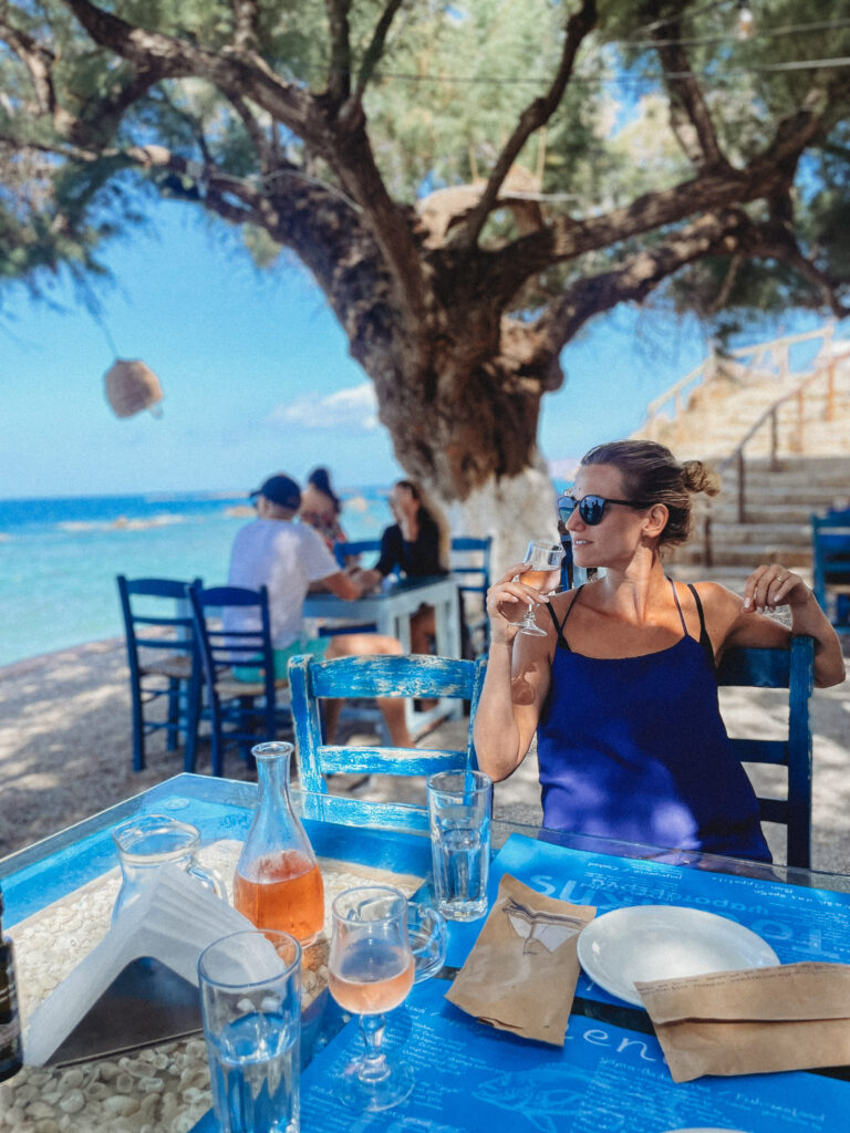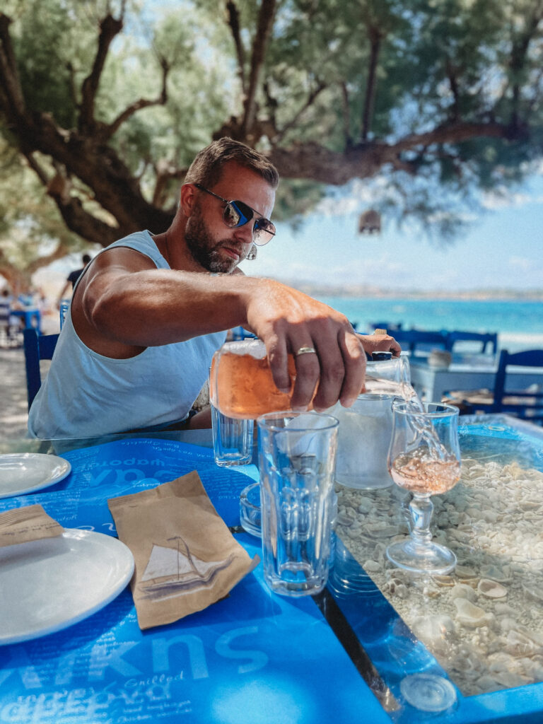 Późnym wieczorem, kiedy słońce zachodziło za horyzont wybraliśmy się naszą trójką na pobliską plażę. Nea Chora którą mieliśmy pod nosem, była niezbyt łaskawie oceniana w Google Maps, więc uznałam, że nic nie stracimy jeśli w ogóle się na nią nie wybierzemy. Cóż to byłaby za strata! Być może w ciągu dnia faktycznie nie była najatrakcyjniejsza, ale jej notowania rosły, z każdą minutą zbliżającego się do tafli wody słońca. Dodatkowo tuż przy brzegu był bar, w którym wieczorem czas spędzali głównie lokalesi. Szum fal, wino, zachodzące słońce, spokój… tak kończyliśmy swój pobyt na wyspie.