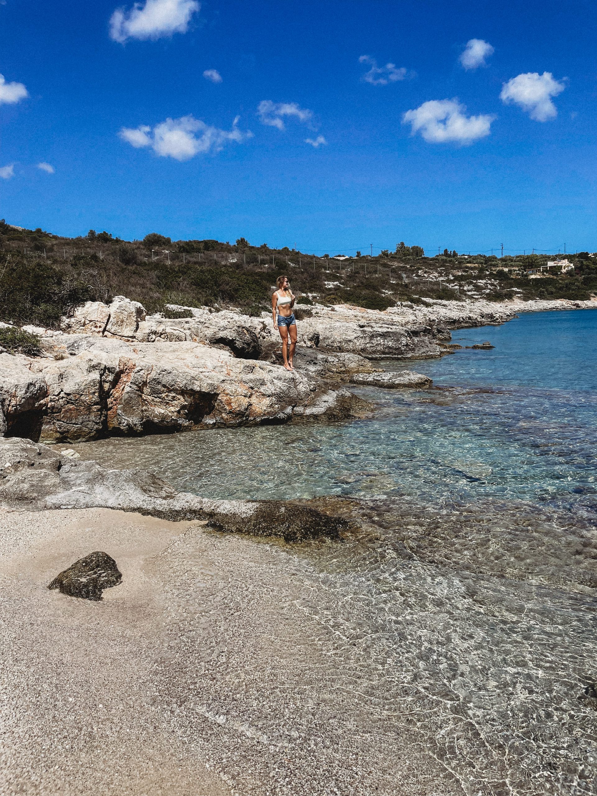 Popołudnie, z drzemiącym w wózku Janem, spędziliśmy na plaży Loutraki. W skali 1-5, oceniam ją na 3. Obok dostępny jest parking. Z dojściem do celu nie ma problemu. Nieopodal jest też restauracja. Woda jest cieplutka (przynajmniej we wrześniu) i krystalicznie czysta. Niestety ogromnym minusem jest piasek, bo niby jest, ale tak jakby go nie było… Trochę mokrego, twardo ubitego piachu i kamienie, średnio przyjemne dla kręgosłupa, a już na pewno niezbyt atrakcyjne dla spragnionych wznoszenia piaskowych budowli, dzieci. Na miejscu można wypożyczyć leżaki i z pewnością wtedy perspektywa jest już znacznie bardziej optymistyczna. Jednak z maluchem, który lada chwila może się obudzić i stanowczo żądać natychmiastowego powrotu na basen, to inwestycja nie warta swojej ceny. Myślę, że trzeba w tym miejscu wspomnieć o tym, że w pobliżu Loutraki znajduje się teren wojskowy, a my mieliśmy przyjemność obserwować ćwiczenia samolotów wojskowych. Dla nas ciekawe doświadczenie, ale dla kogoś kto chce w CISZY poczytać książkę, już niekoniecznie. Warto wziąć pod uwagę tę „atrakcję” planując pobyt na tej właśnie plaży.