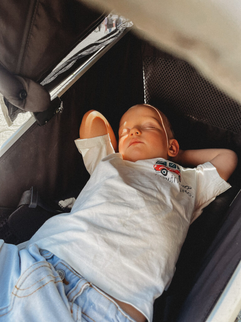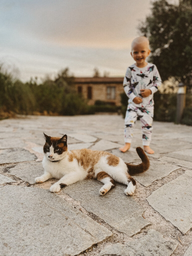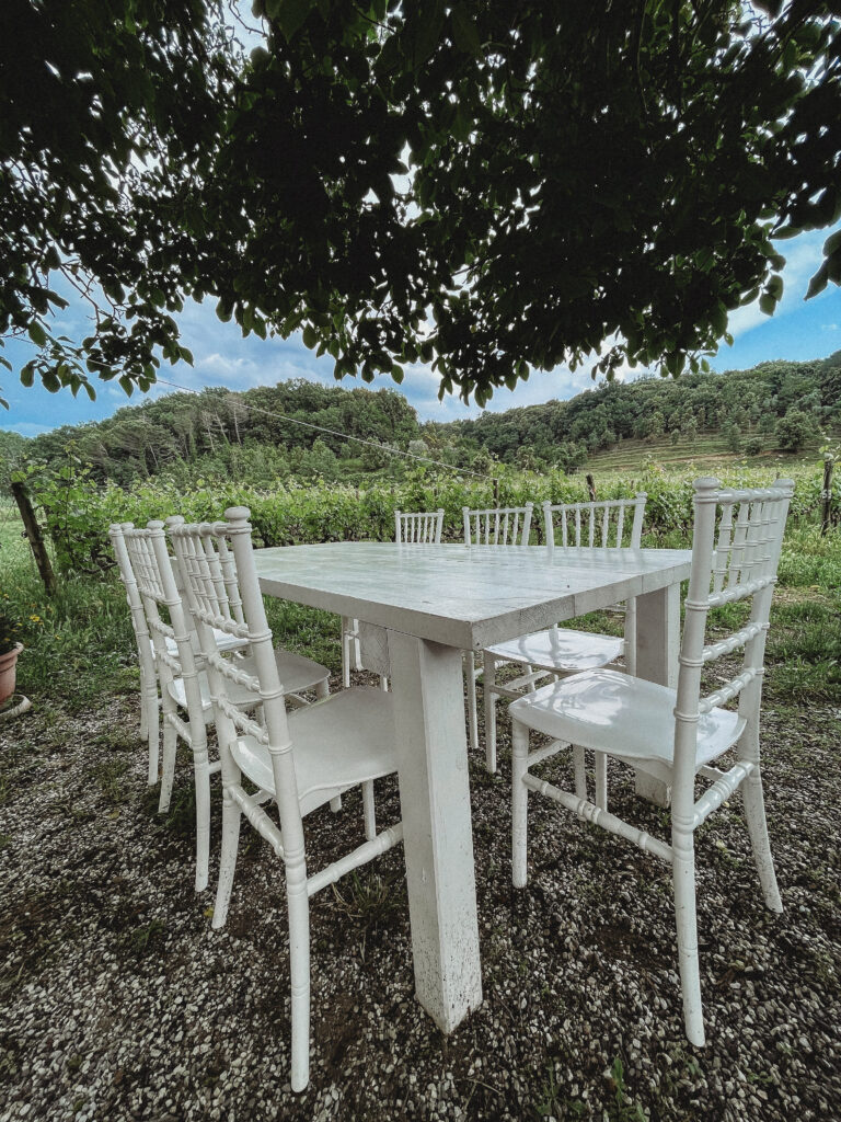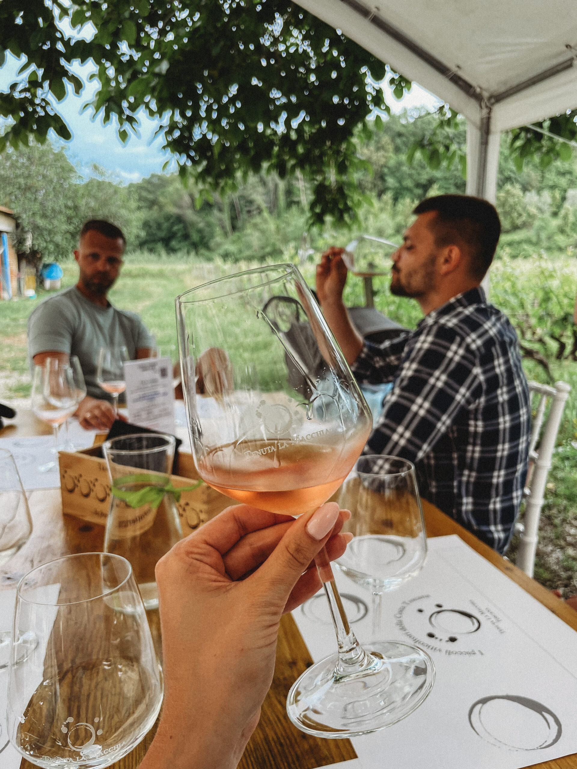 Kolejnego dnia nie deszcz, a grad zaskoczył nas swoją obecnością! Z nieba leciały kulki wielkości M&Msów! W planach mieliśmy wycieczkę do winnicy, ale mając wizję picia wina w takich okolicznościach przyrody, powoli szukaliśmy alternatywnych opcji na spędzenie tamtego popołudnia. Był to jednak ostatni dzień naszego pobytu i tym samym ostatnia szansa, kiedy mogliśmy sobie pozwolić na tę przyjemność. Podjęliśmy więc rękawicę i ruszyliśmy w kierunku Tenuta la Macchia. Pogoda tym razem okazała się dla nas nieco łaskawsza i po gradobiciu wyszło piękne słońce. Jasiek wyczuwał chyba w powietrzu zbliżający się Dzień Matki i postanowił zasnąć akurat na czas degustacji wina.