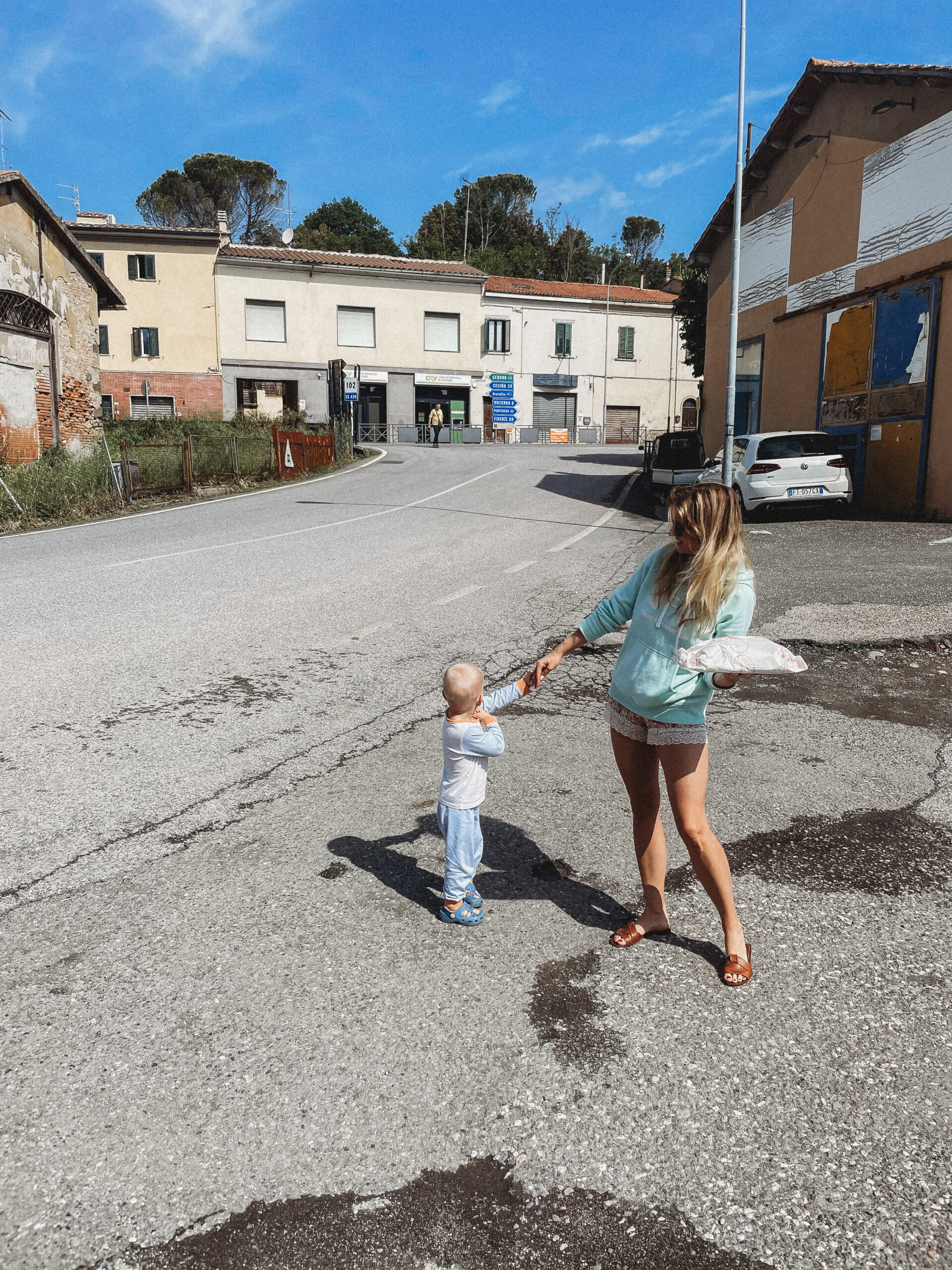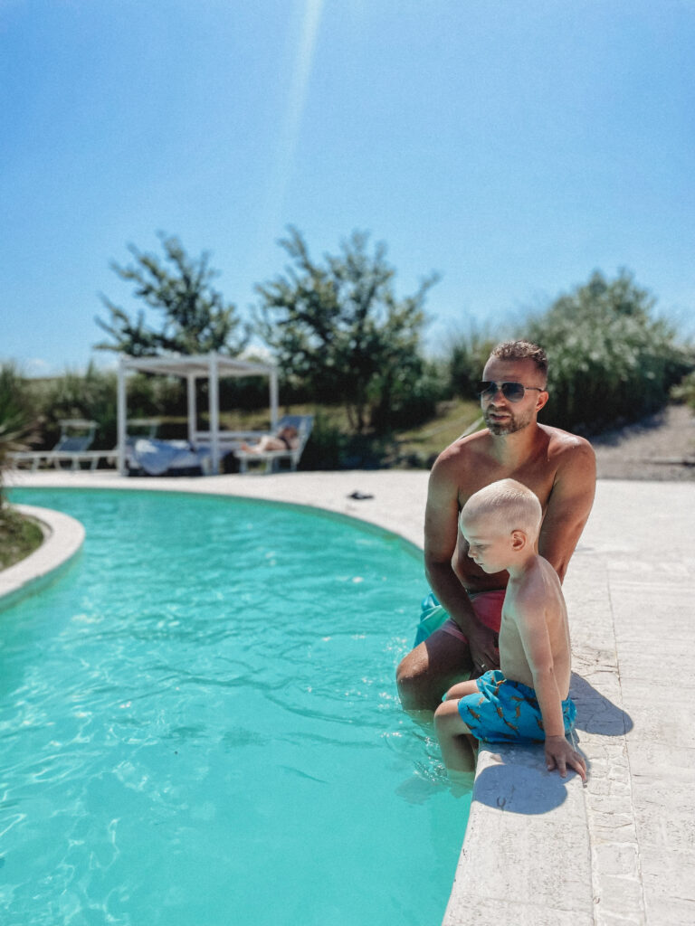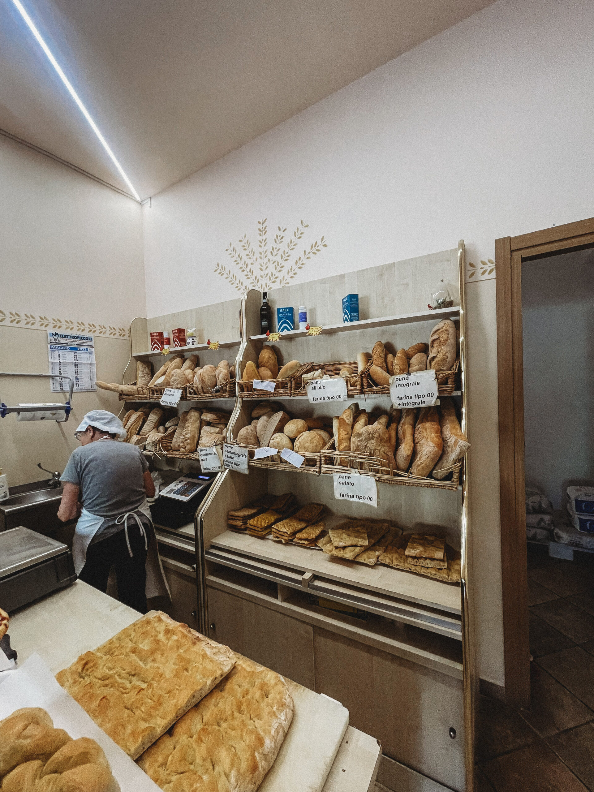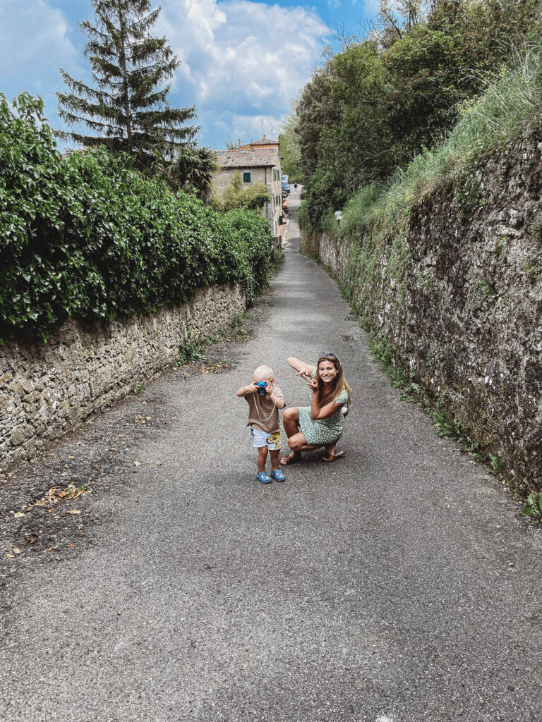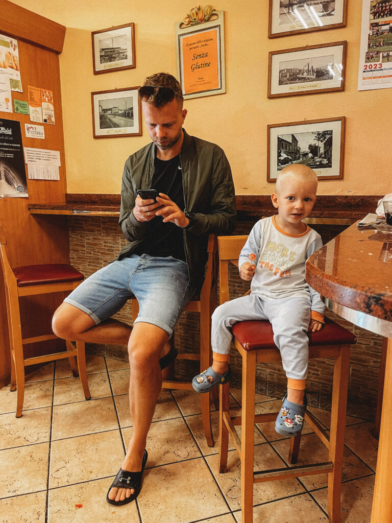 Na codzienne zakupy jeździliśmy do Saline di Volterra– małej wioski, która na pierwszy rzut oka nie oferowała nic szczególnego, tymczasem z każdym dniem odkrywaliśmy w niej coś nowego. Raz piekarnie, która zapachem świeżo upieczonego chleba skusiłaby do grzechu największego przeciwnika glutenu. Innym razem sklep mięsny, jeszcze innym warzywniak. No i sklep z winem i oliwą, ale ten odkryliśmy już pierwszego dnia i o tym kilka linijek niżej😊 Było tam więc wszystko, co niezbędne do życia. Była też Pasticceria Perla… Będąc na urlopie, mamy niepisany zwyczaj wynajdywanie miejsc, w których staramy się wtopić w tłum lokalesów, podglądając i uczestnicząc jednocześnie w ich codziennych zwyczajach. W Saline takim miejscem była dla nas właśnie ta cukiernia, w której rano piliśmy kawę i kupowaliśmy croissanty (te z nadzieniem pistacjowym to mój zdecydowany faworyt!). Pani ekspedientka zawsze witała Jasia ciasteczkiem maślanym i serdecznym uśmiechem. Widać było, że każdy kto tam wchodził dobrze znał się z obsługą. Na jednej z pokrytych żółtą farbą ścian, wisiała tablica z ogłoszeniami, na innej kalendarz ze zdjęciami lokalnej drużyny piłkarskiej, na kolejnej natomiast czarno-białe fotografie przedstawiające miasto sprzed lat. Nie było tam niczego „fancy”, niczego boho, niczego przy czym można byłoby zrobić fotkę za miliony lajków, ale był niepowtarzalny klimat i to nam zupełnie wystarczało!