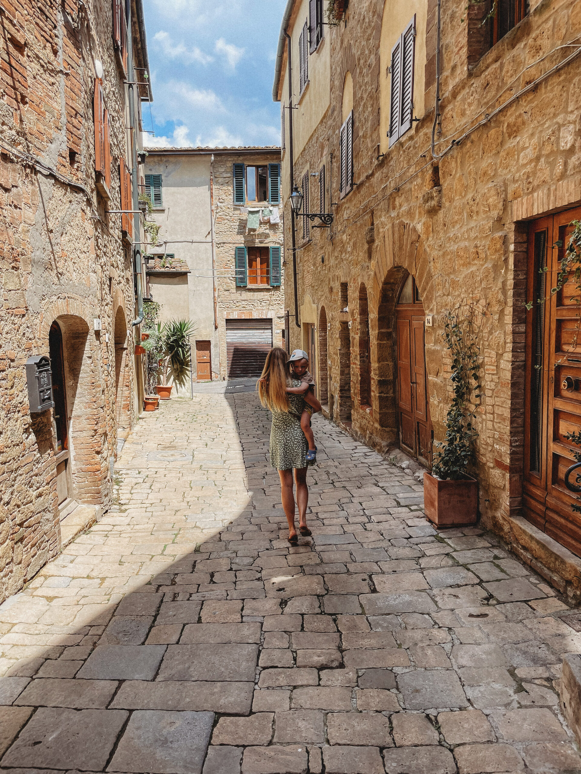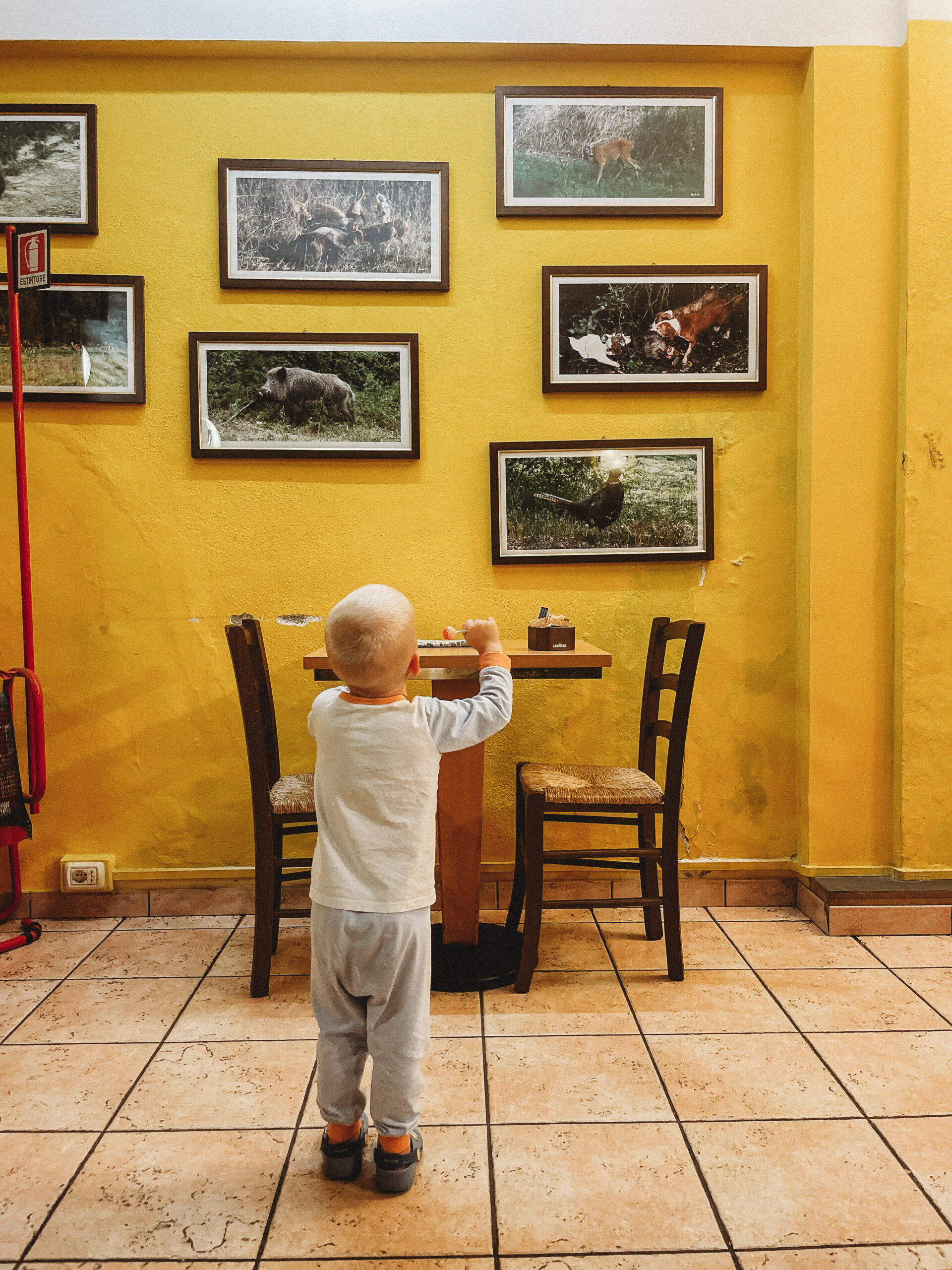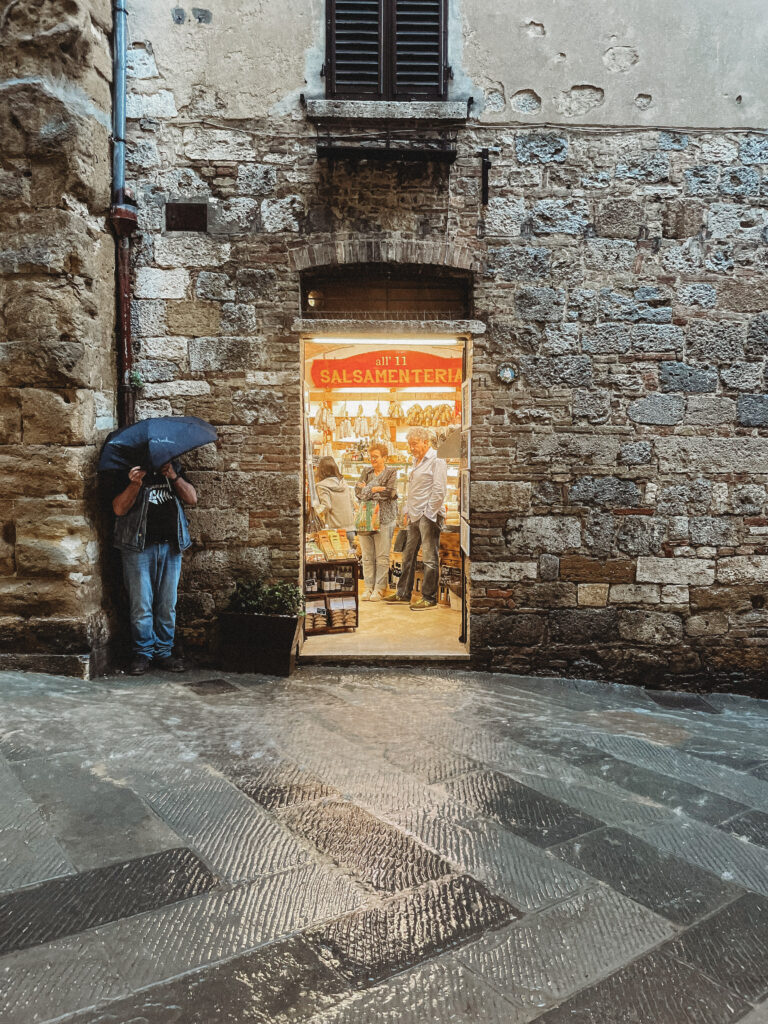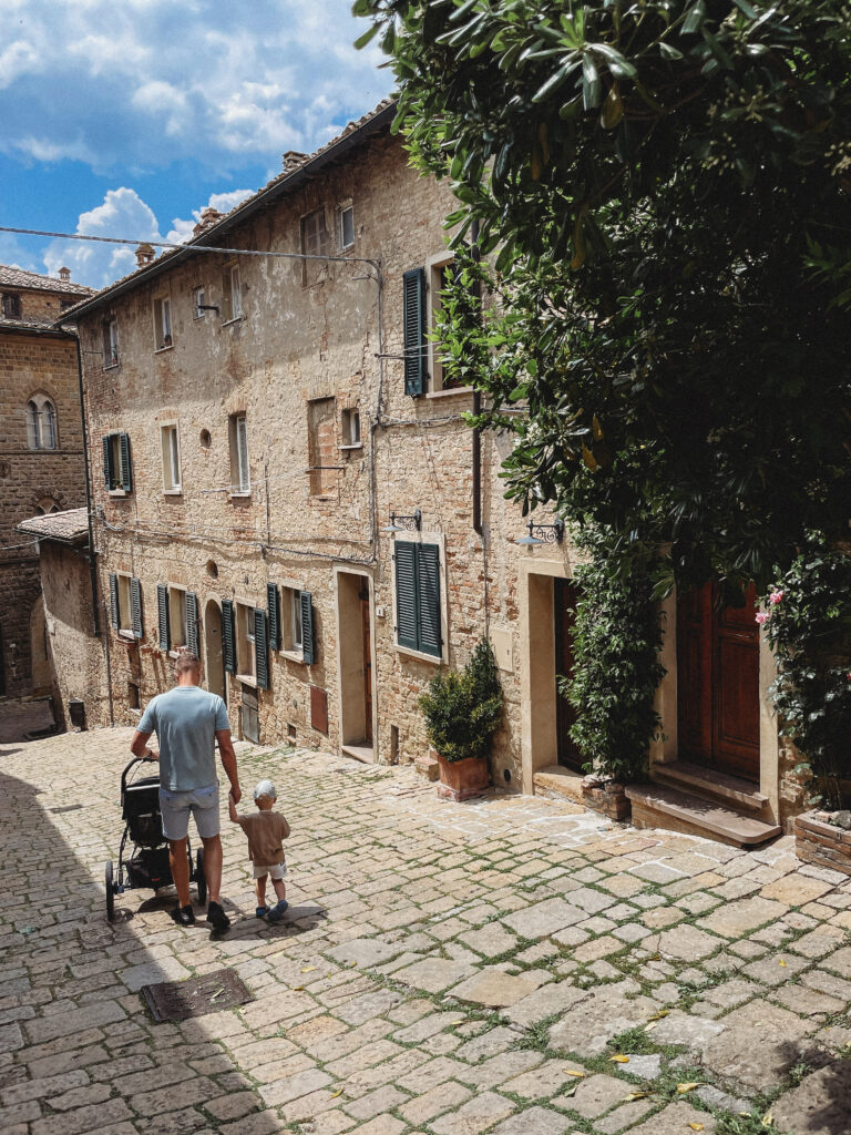 Na codzienne zakupy jeździliśmy do Saline di Volterra– małej wioski, która na pierwszy rzut oka nie oferowała nic szczególnego, tymczasem z każdym dniem odkrywaliśmy w niej coś nowego. Raz piekarnie, która zapachem świeżo upieczonego chleba skusiłaby do grzechu największego przeciwnika glutenu. Innym razem sklep mięsny, jeszcze innym warzywniak. No i sklep z winem i oliwą, ale ten odkryliśmy już pierwszego dnia i o tym kilka linijek niżej😊 Było tam więc wszystko, co niezbędne do życia. Była też Pasticceria Perla… Będąc na urlopie, mamy niepisany zwyczaj wynajdywanie miejsc, w których staramy się wtopić w tłum lokalesów, podglądając i uczestnicząc jednocześnie w ich codziennych zwyczajach. W Saline takim miejscem była dla nas właśnie ta cukiernia, w której rano piliśmy kawę i kupowaliśmy croissanty (te z nadzieniem pistacjowym to mój zdecydowany faworyt!). Pani ekspedientka zawsze witała Jasia ciasteczkiem maślanym i serdecznym uśmiechem. Widać było, że każdy kto tam wchodził dobrze znał się z obsługą. Na jednej z pokrytych żółtą farbą ścian, wisiała tablica z ogłoszeniami, na innej kalendarz ze zdjęciami lokalnej drużyny piłkarskiej, na kolejnej natomiast czarno-białe fotografie przedstawiające miasto sprzed lat. Nie było tam niczego „fancy”, niczego boho, niczego przy czym można byłoby zrobić fotkę za miliony lajków, ale był niepowtarzalny klimat i to nam zupełnie wystarczało!
