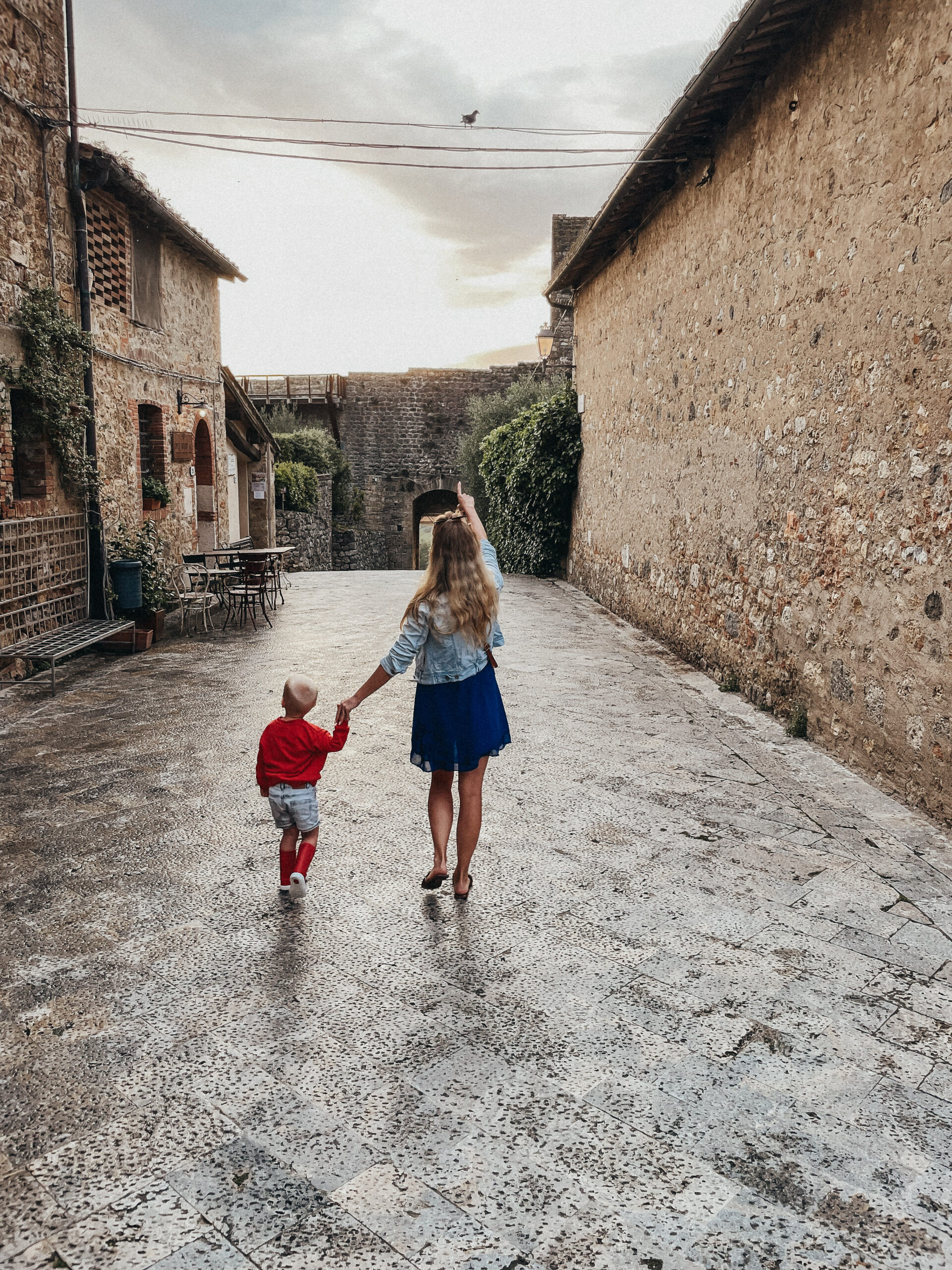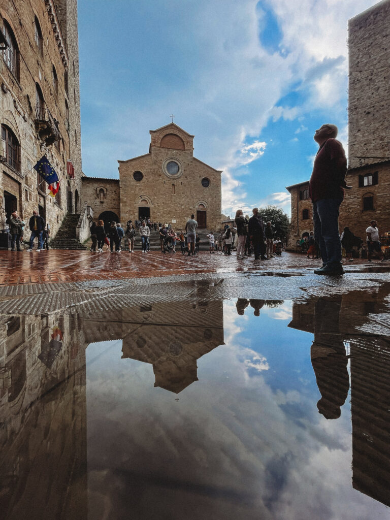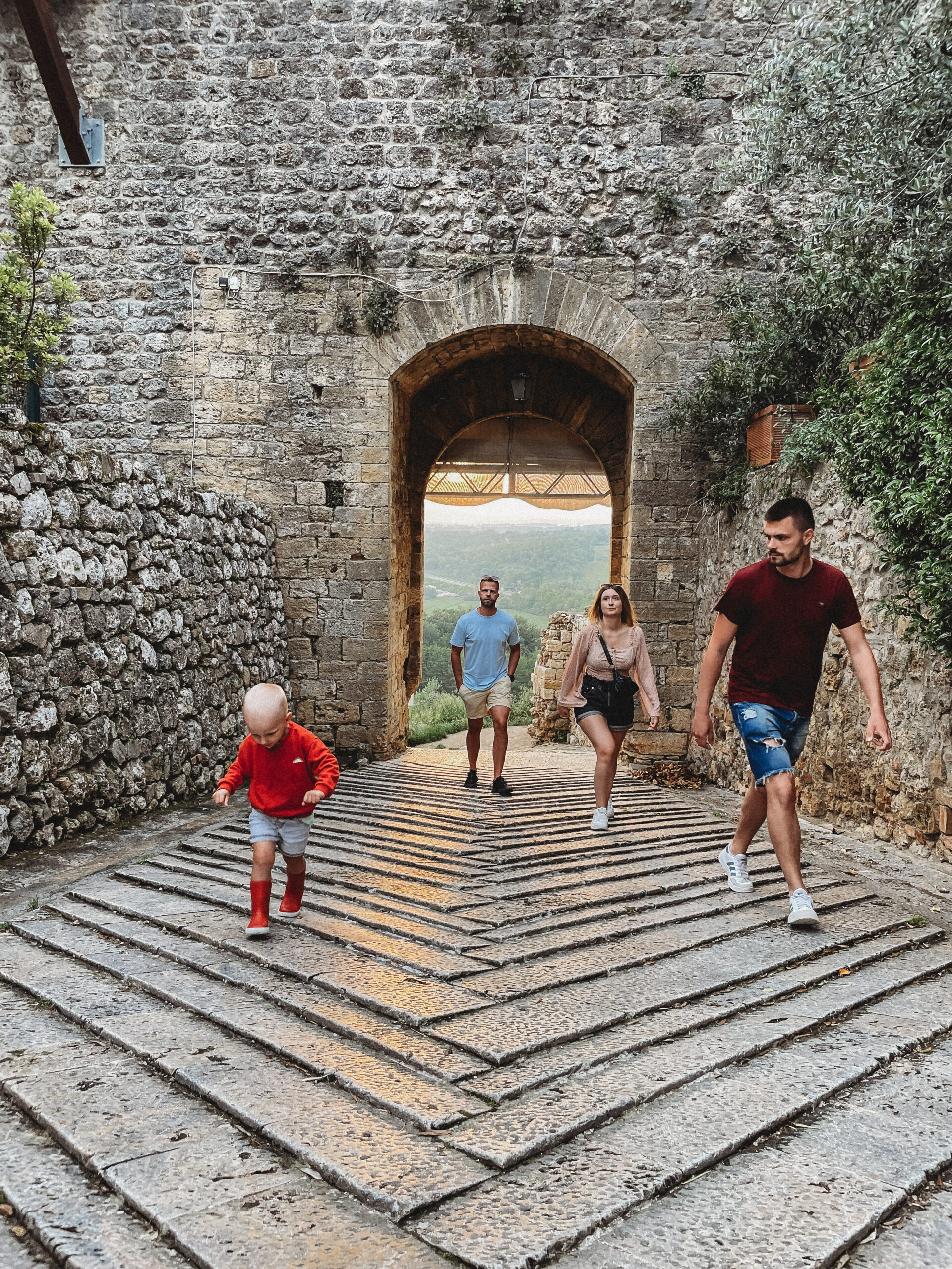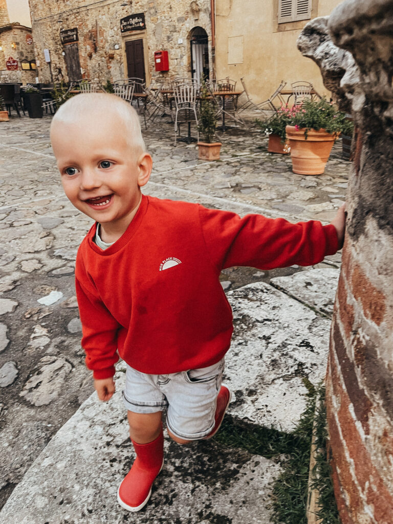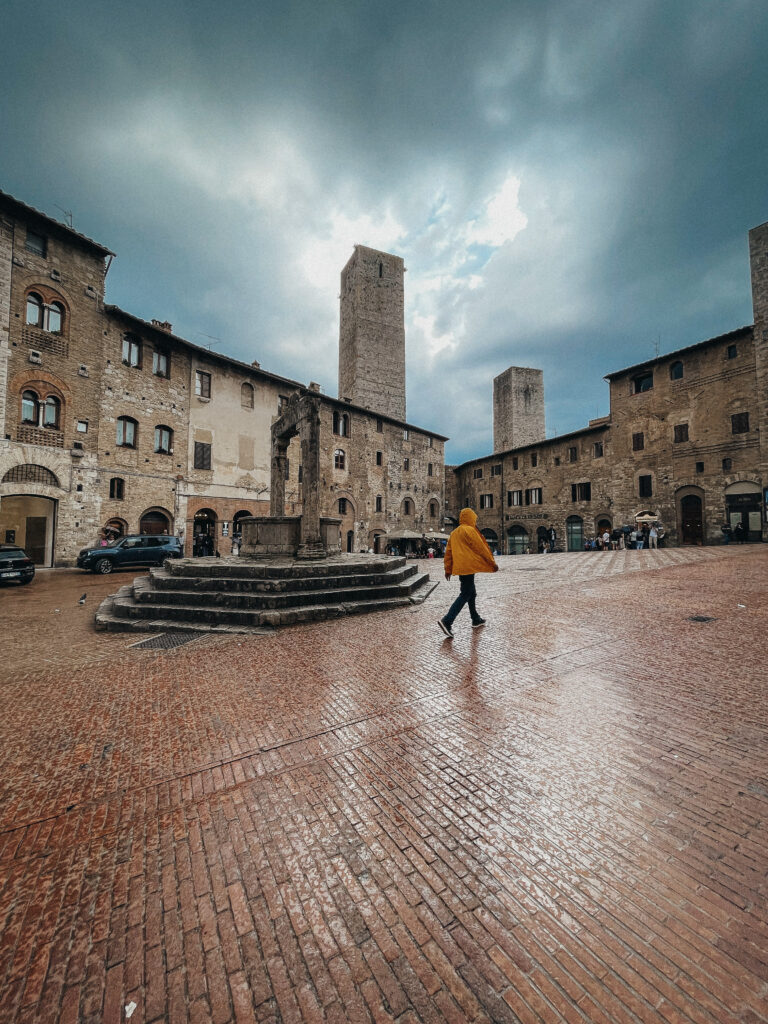 Kolejnego dnia powitało nas słońce! Była nadzieja, a jak wiadomo nie od dziś – nadzieja matką głupich, o czym przekonaliśmy się tamtego dnia. Korzystając ze sprzyjającej pogody, udaliśmy się do Volterry, w której akurat odbywał się festiwal wampirów i innych upiornych stworów. Volterra to jedno z tych miast, w których się nie „odhacza”, a po których warto się powłóczyć, pozaglądać w ukwiecone bramy i zgubić w średniowiecznych uliczkach. Podobnie, jak zresztą w San Gimigiano, do którego udaliśmy się później, uciekając przed zbliżającą się do miasta, burzą. Dotarliśmy do celu, kiedy w powietrzu unosił się już zapach nadchodzącego żywiołu… Naiwnie wierząc, że deszcz „przejdzie bokiem”, dziarsko ruszyliśmy w miasto, po drodze zatrzymując się jeszcze na, nie bez powodu owiane sławą, lody! Zajadając się porcją cytrynowego deseru doszliśmy do głównego placu i wtedy właśnie spadł on – deszcz, a właściwie to porządne deszczysko, które rozproszyło tłum turystów, sprawiając, że centrum miasta zupełnie się wyludniło. Chwilę później przestało padać, by za chwile znów zaskoczyć potężna ulewą, która nie pozostawiała złudzeń – lepiej nie będzie, czas na ewakuacje. Najmłodszy uczestnik wycieczki smacznie przespał całe widowisko i obudził się dopiero kiedy wszyscy, przemoknięci do suchej nitki i porządnie przemarznięci, wróciliśmy do samochodu. Wieczorem Jasiek uzbrojony w kalosze biegał po wszystkich możliwy kałużach i chyba jako jedyny z całej ekipy miał zupełnie gdzieś jaka jest pogoda, bo przecież w każdej jest coś fajnego.