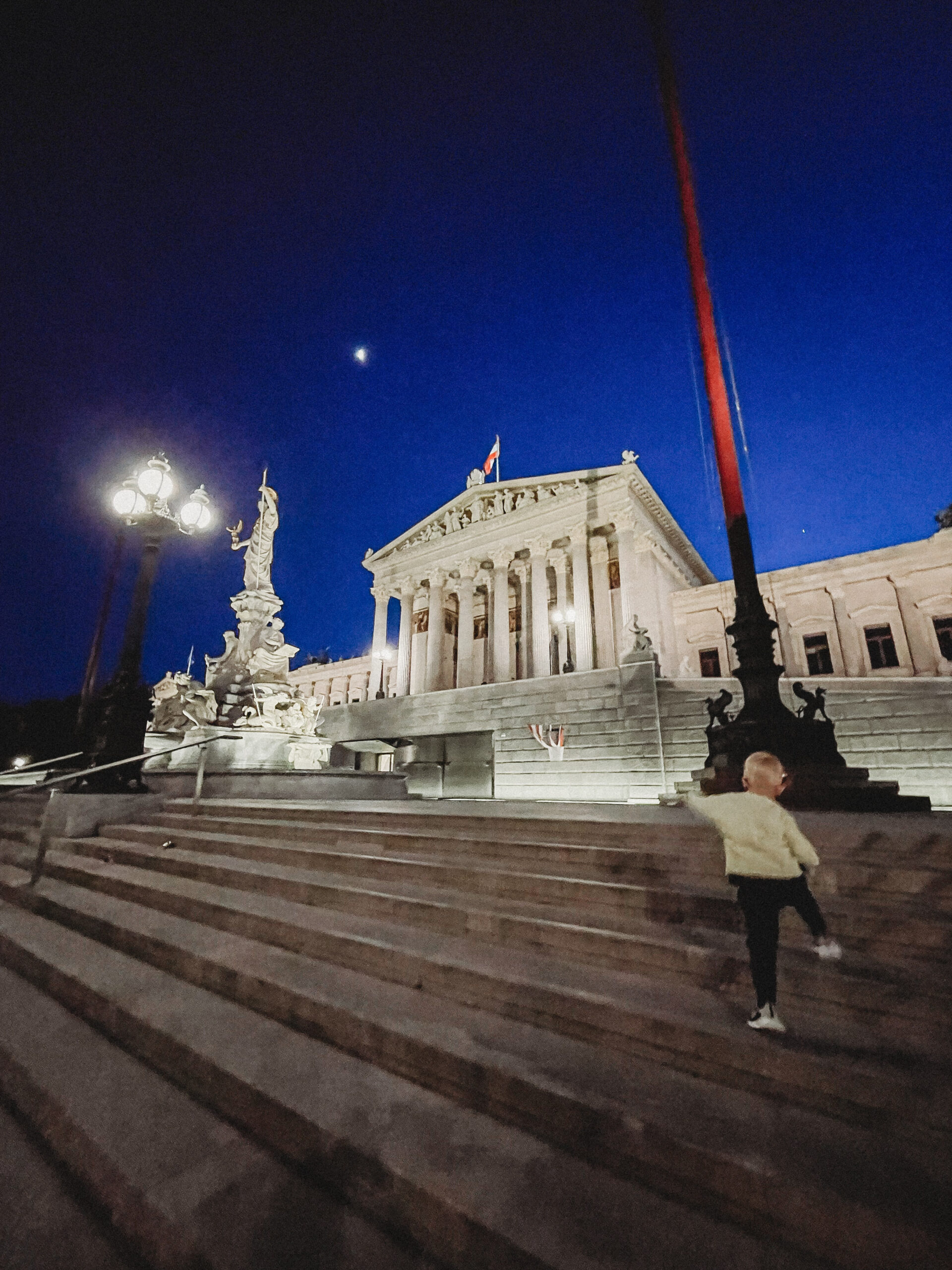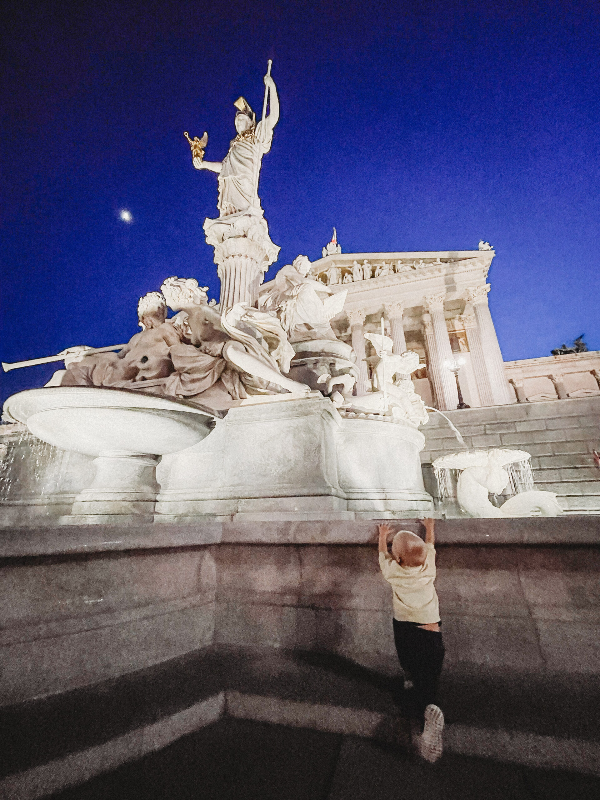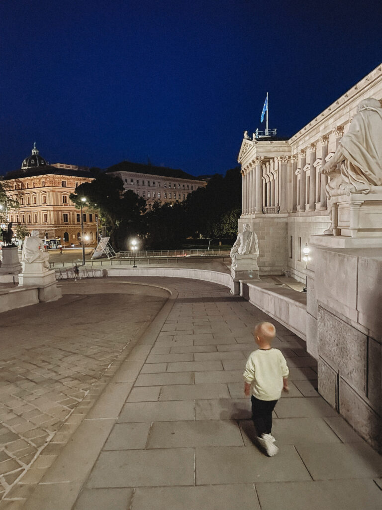 Wiedeń przywitał nas natomiast znacznie spokojniej i kulturalniej. Kiedy dojechaliśmy do naszego apartamentu, zbliżał się wieczór. Mimo zmęczenia trasą, nie daliśmy za wygraną i zdecydowaliśmy się na miejski tour pod rozgwieżdżonym niebem. Ostatni raz w Wiedniu byłam zimą, piłam grzane wino i spacerowałam od jarmarku do jarmarku. Latem, jak się pewnie domyślacie, miejski vibe był zupełnie inny, znacznie bardziej… imprezowy! Mimo późnej pory miasto żyło, żyło bardzo intensywnie. Ludzie siedzieli i rozmawiali na trawie i chodnikach, w barach, parkach i restauracjach. Pili drinki, jedli lody, śmiali się, a ja z dzielnym 2-latkiem u boku przemierzałam to pełne imponujących budynków i interesującej architektury, miasto. Fajnie tak się z Tobą włóczyć synku i na nowo odkrywać jak zachwycający może być księżyc i gwiazdy na niebie.