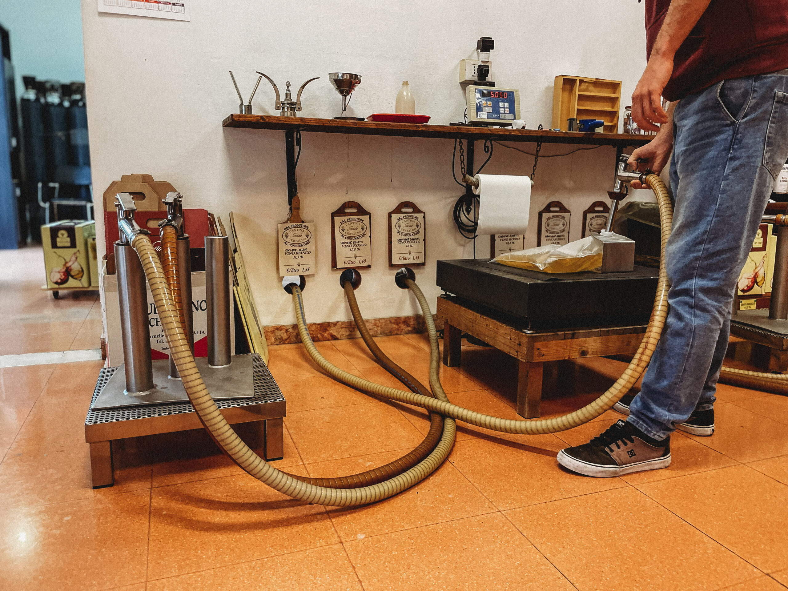 W związku z deszczową aurą, która zastała nas po przyjeździe i ogólnym zmęczeniem po kilkunasto- godzinnej podróży, udzielił się nam barowy nastrój. Na pierwsze zakupy ruszyliśmy właśnie do Saline, wioski w której życie toczy się w bardzo włoskim rytmie. Ekspedient nalał nam wino do 5-litrowego worka (był to najmniejszy worek jaki można było tam dostać!) i schował go w karton, który rekomendował zachować, na wypadek kolejnej wizyty. Podczas naszej wizyty w sklepie przewijali się inni klienci, z mocno sfatygowanymi już kartonami do których tankowali alkohol, tak jak tankuje się benzynę na stacjach paliw. Przychodzili po wino, jak po bułki! Starzy, młodzi, WSZYSCY! Być może to właśnie w winie tkwi nie tylko prawda, ale też sekret długowieczności Włochów:)!