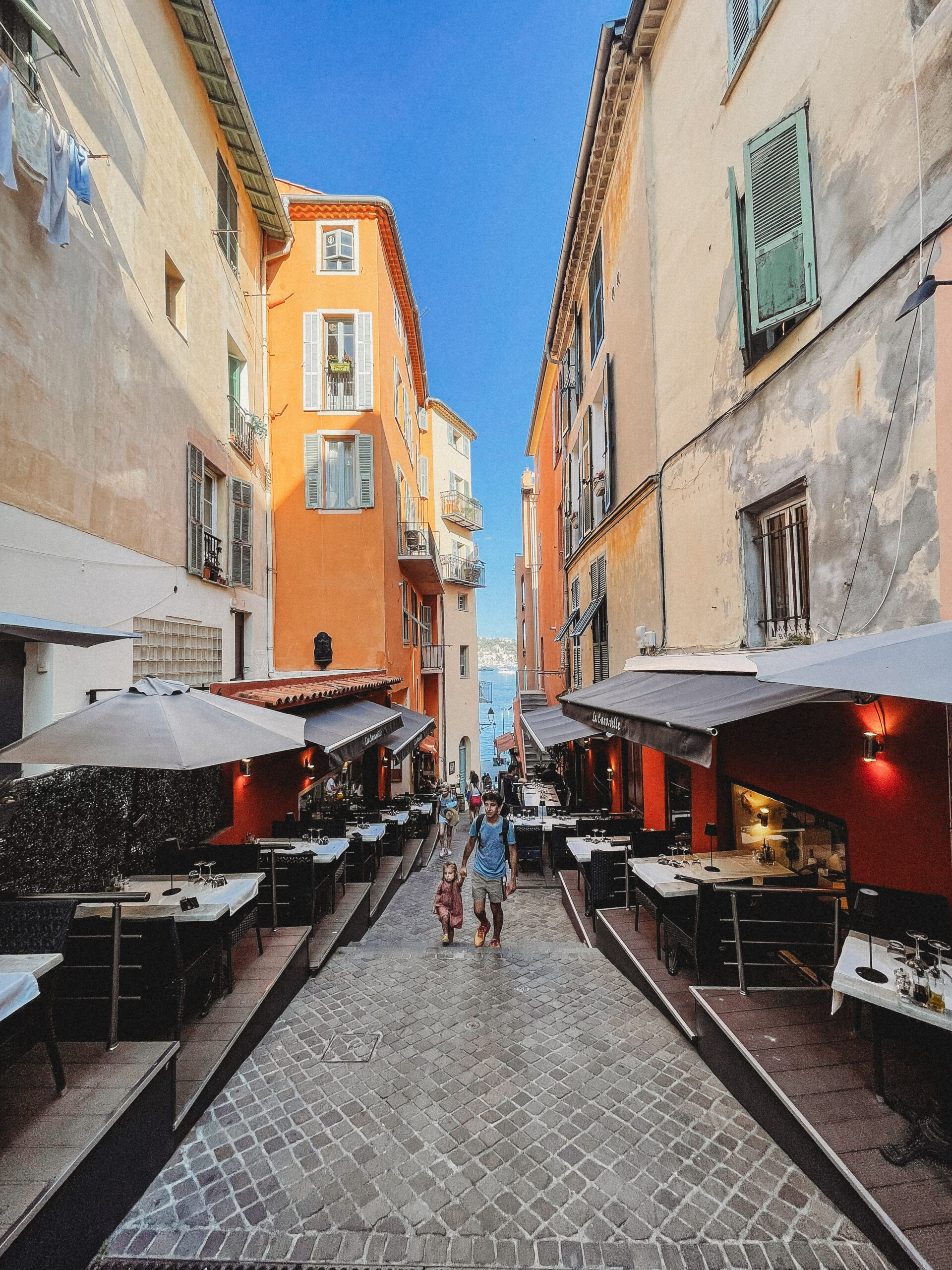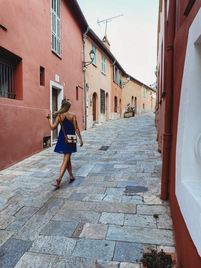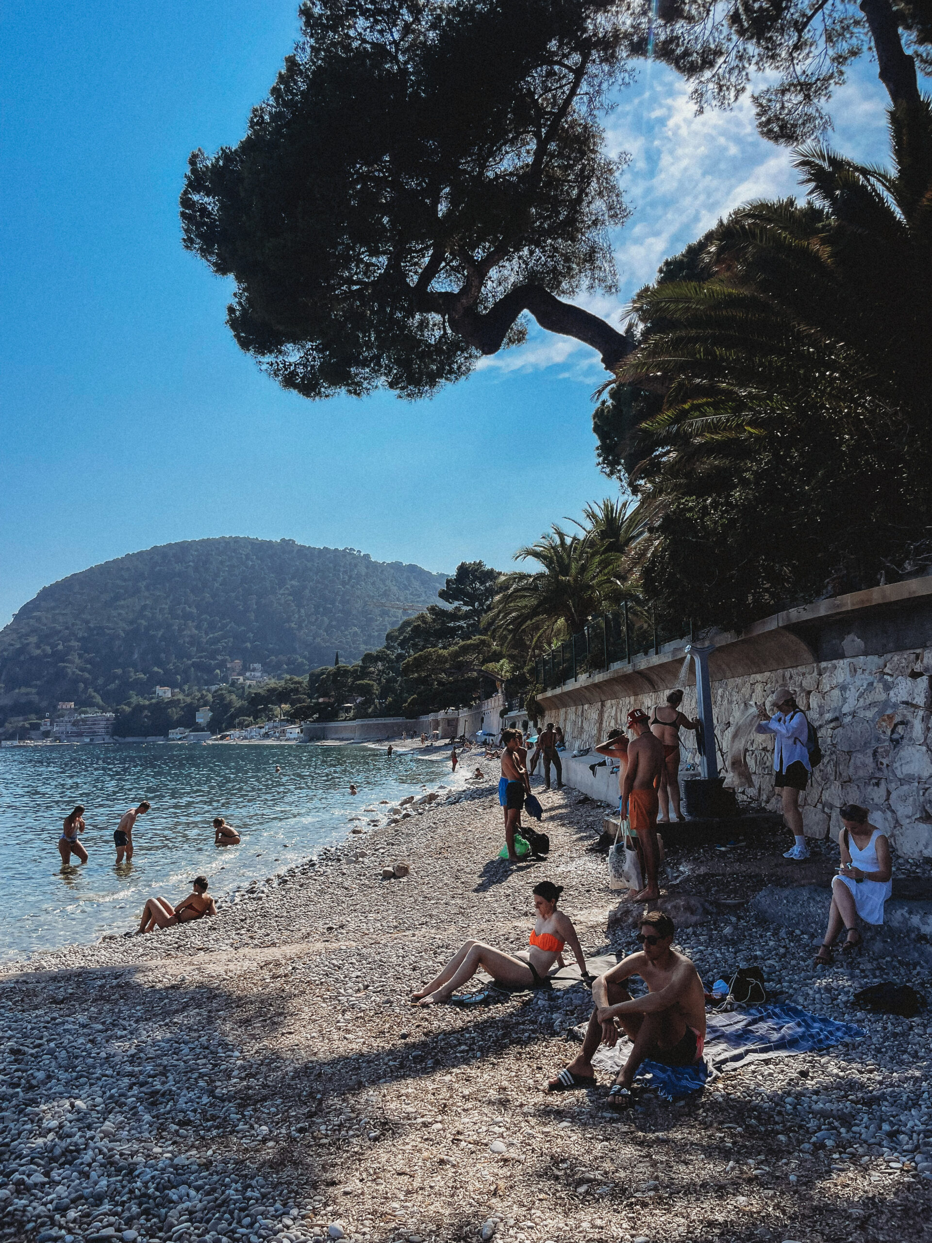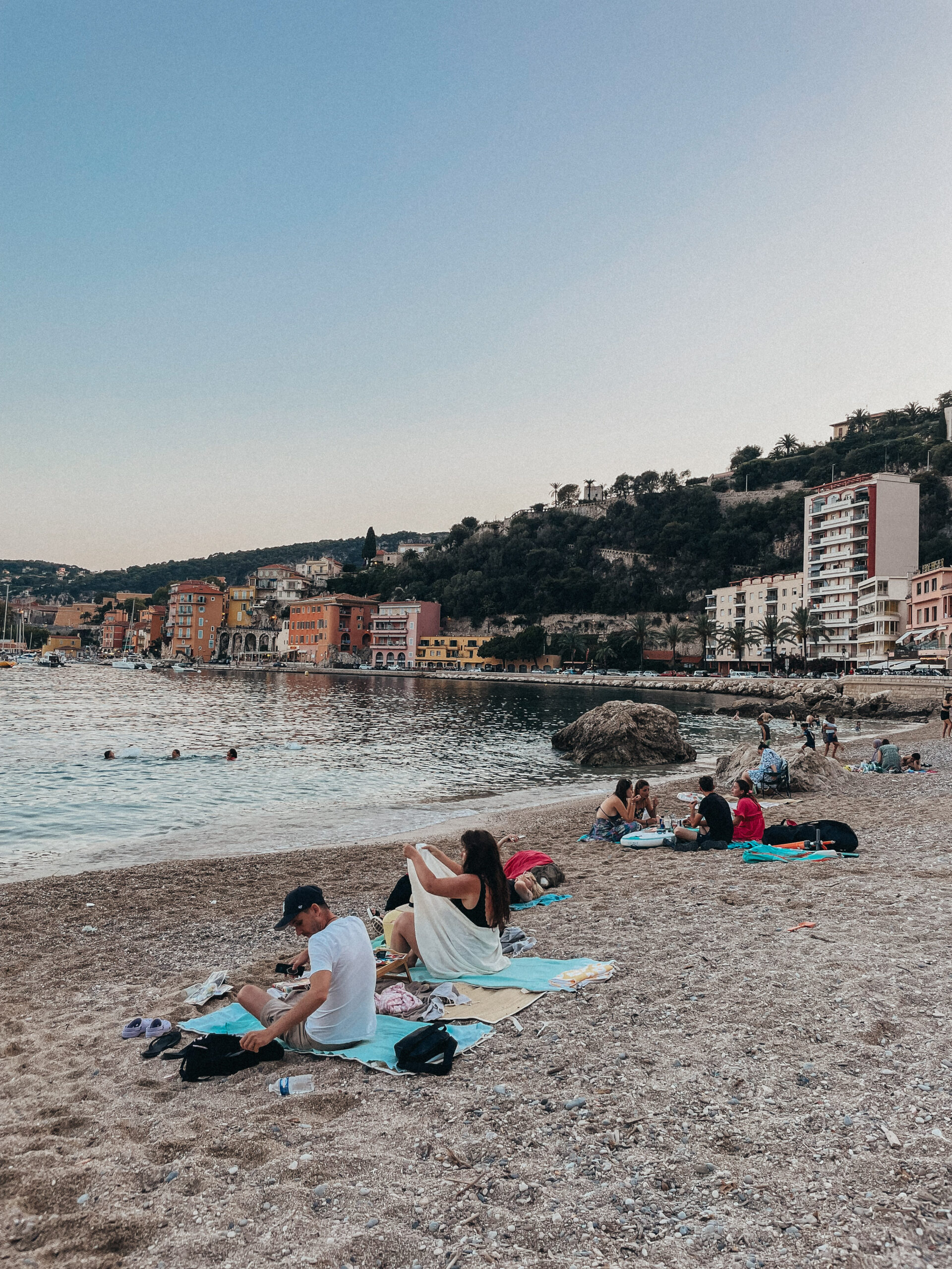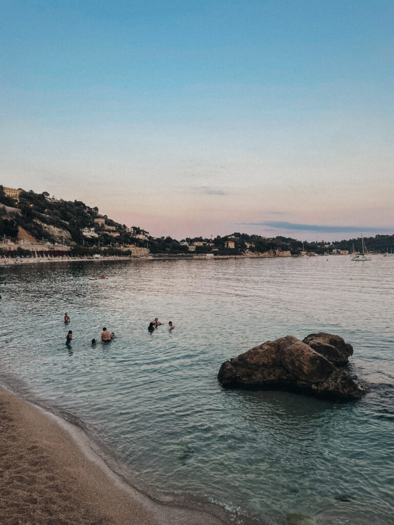 Kilka kilometrów dalej i kilka drinków później siedziałyśmy w pociągu, który do kolejnej stacji jechał maksymalnie 10 minut. Na tyle krótko, że prawie przegapiłyśmy nasz przystanek – Villefranche-sur-Mer. Miejscowość położona niezwykle blisko Nicei, a jednak zupełnie inna, bardziej cicha, kameralna i romantyczna. Pełna schodów i pięknych ludzi, kobiet w zwiewnych, kwiecistych sukienkach i panów w lnianych koszulach. Zachodzące słońce nie przeszkadzało nikomu w morskich kąpielach przy żwirkowej plaży, na tle pastelowych kamieniczek Villefranche. W takich okolicznościach żegnałyśmy nasz pierwszy lazurowy dzień.