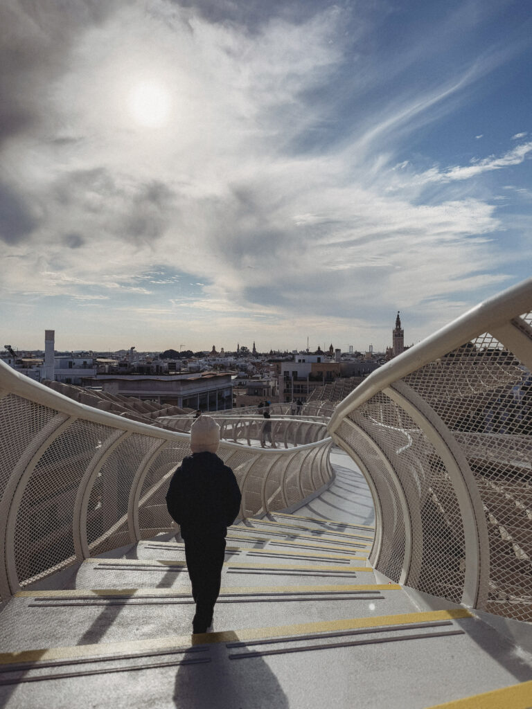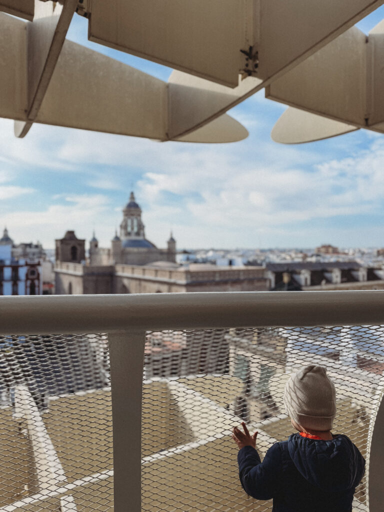 Kiedy Stefik zasnął udało mi się porwać Janka na Setas de Sevilla, czyli największą drewnianą konstrukcję w Europie. Bilet kosztował około 15 euro i upoważniał do dwukrotnego wejścia, więc wieczorem ponownie odwiedziliśmy to miejsce. Płaciłam tylko ja, Janek miał wstęp gratis. Kiedy Andrzej w towarzystwie śpiącego niemowlaka pił w spokoju kolejne espresso, my biegaliśmy po schodach w chmurach. Udało nam się nawet zaliczyć 10-minutowy seans filmowy o kulturze i tradycji andaluzyjskiej:) Z naszej „randeczki”, jak nazywamy z Jasiem wyjścia tylko we dwoje, wyrwał nas telefon od taty – Stefan się obudził, wracajcie. Tak oto mąż ściągnął nas dosłownie z nieba na ziemię, a kolejnego dnia zabrał nad morze.