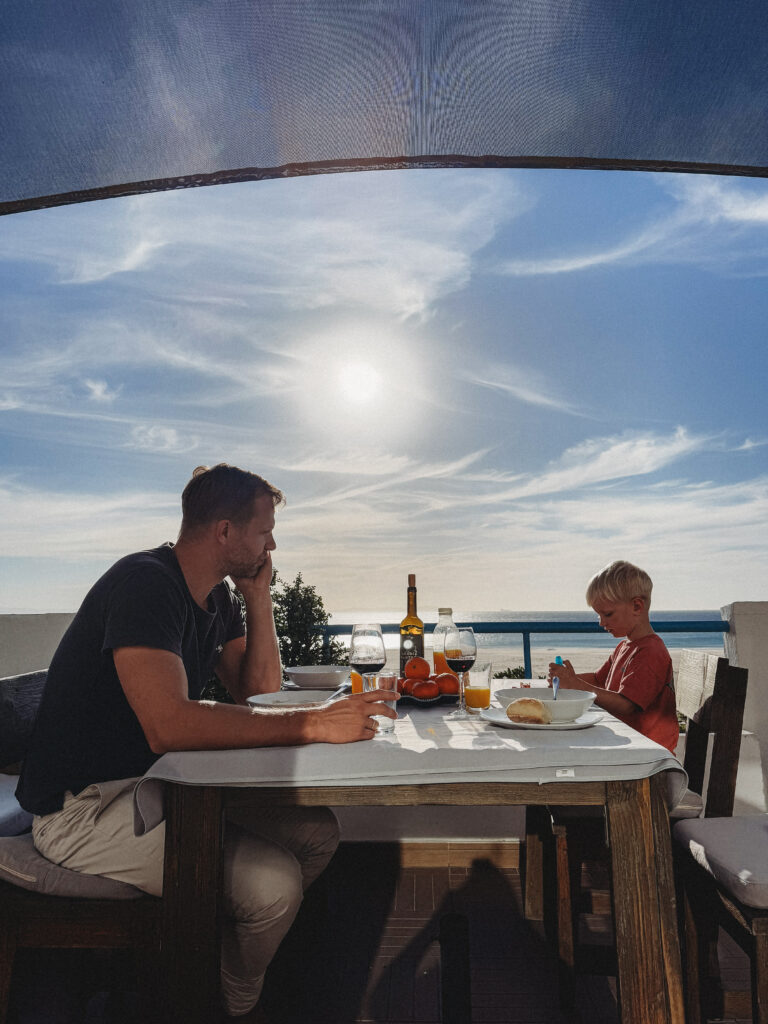 Wiatr z każdym dniem się wzmagał, ale nie doskwierało nam to jakoś szczególnie mocno. Nasz taras był osłonięty, a widok z niego osłodziłby nam chyba nawet największy sztorm. Co wieczór obserwowaliśmy czerwone zachody słońca, a kiedy Stefek budził się w nocy spacerując z nim po mieszkaniu słyszałam śpiew fal, które koncertowały tuż pod naszym oknem. Samo mieszkanie daleko odbiegało od ideału, ale widok i lokalizacja tuż przy samej Playa de los Lances sprawiły, że czas spędzony w Tarifie zasłużył na noty 10/10. Chyba dopiero tam, codziennie budząc się z widokiem na smaganą wiatrem, pustą plaże, poczułam spokój, taki wakacyjny stan relaksu. Mimo, że z dwójką dzieci trudno o relaks, w tradycyjnym rozumieniu tego słowa.