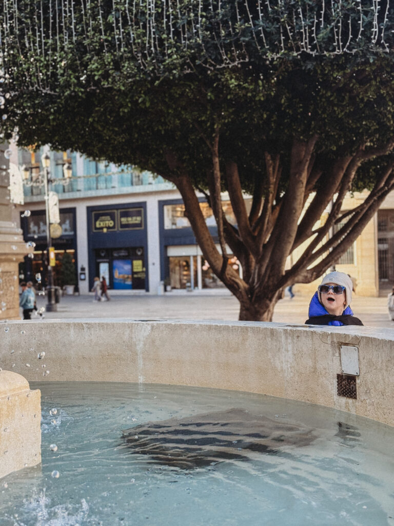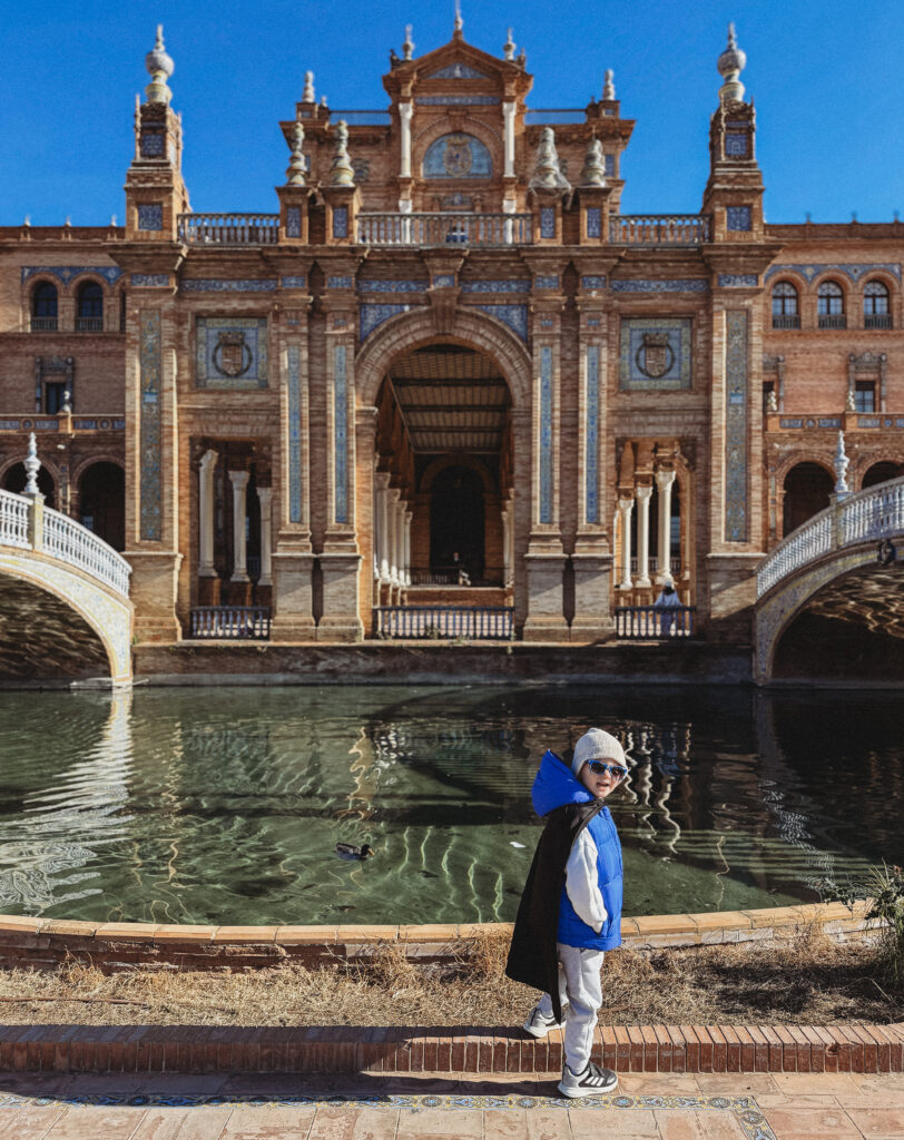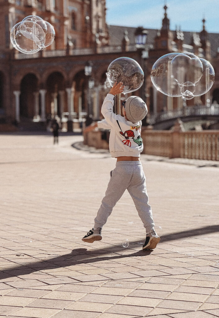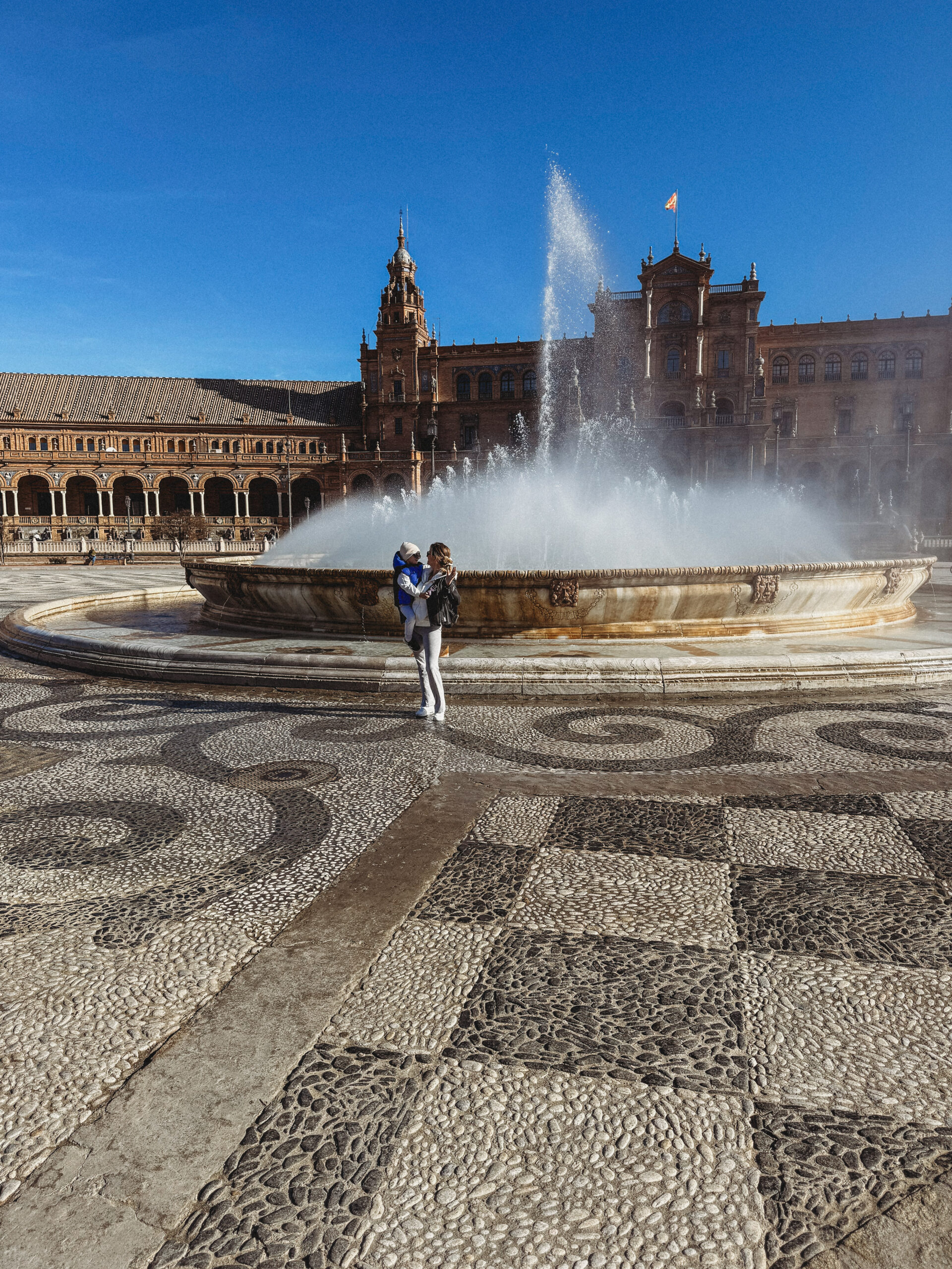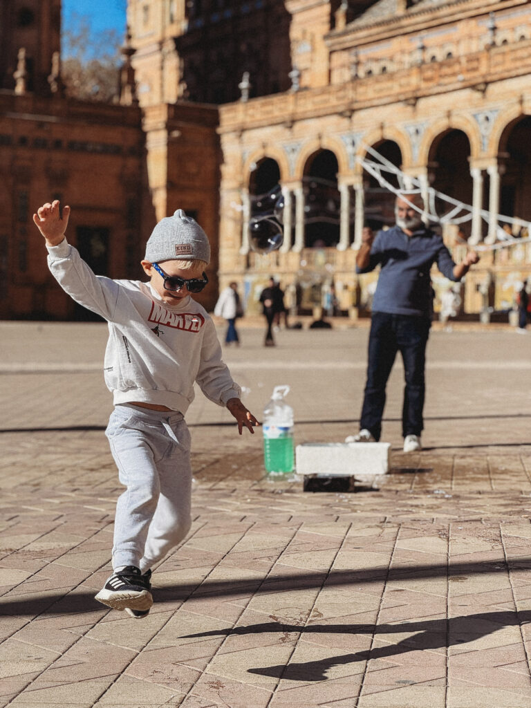 Wpadliśmy też z wizytą na Plaza de Espana, który nie bez powodu jest totalnym „must see”. Na zawsze w mojej głowie utkwi obraz placu skąpanego w pełnym słońcu, tęczy nad fontanną, Jaśka biegającego za mydlanymi bańkami i skrzypka grającego w tle Hallelujah Cohena. Kiedy w wyobraźni wracam do tamtej chwili czuję, że dla takich momentów warto podróżować mimo wszelkich niedogodności.